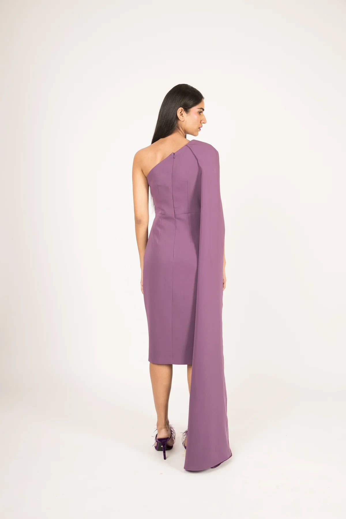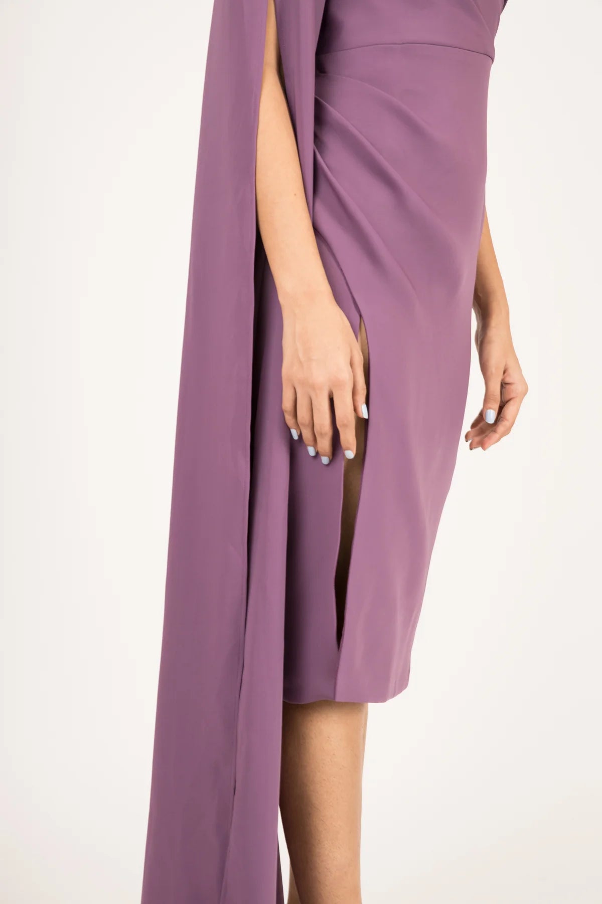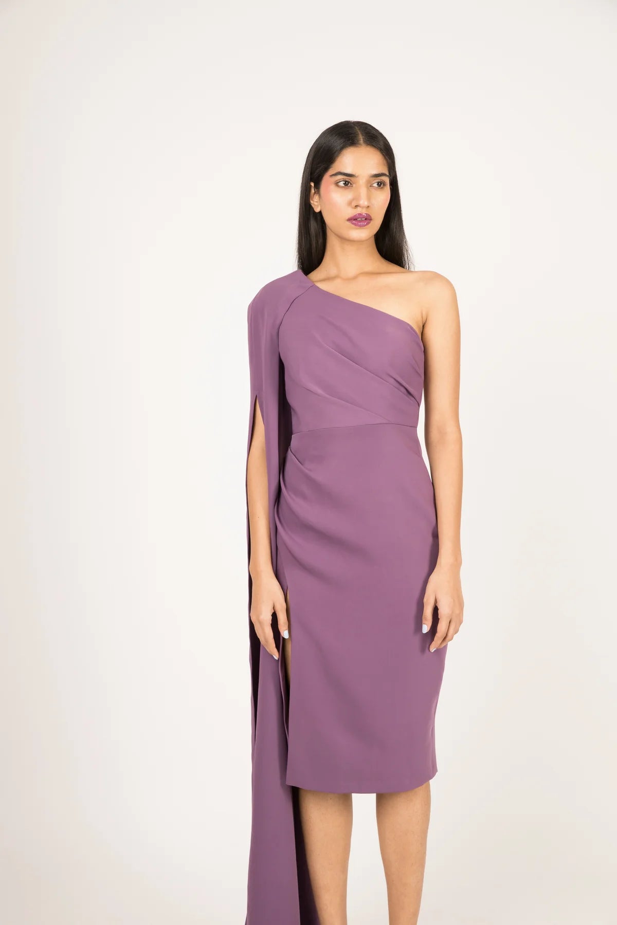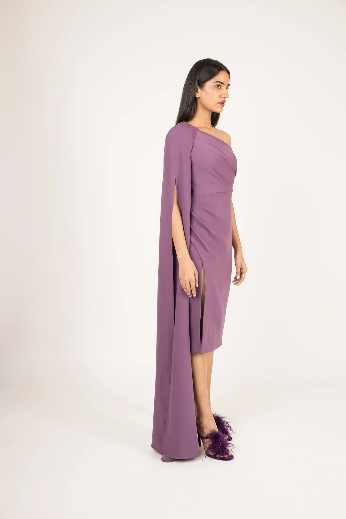 One-shoulder draped midi dress with a built-in cape sleeve and soft gathered detailing at the bodice. Finished with a sharp side slit.