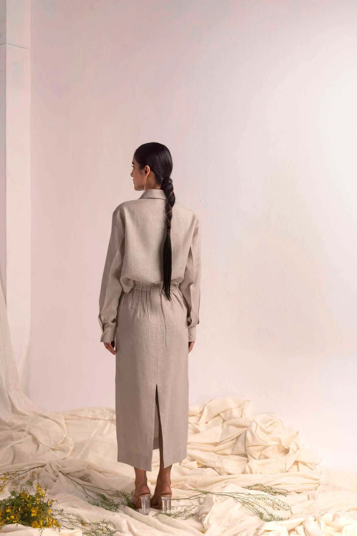 This co-ord set has a linen shirt with a classic collar, front button opening, and full sleeves with cuffs. The matching pencil skirt has side and back slits and a front button opening with elasticated back, offering a stylish and comfortable fit