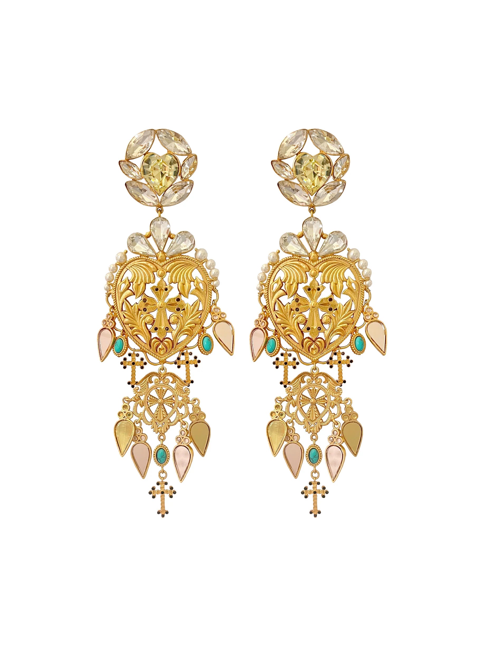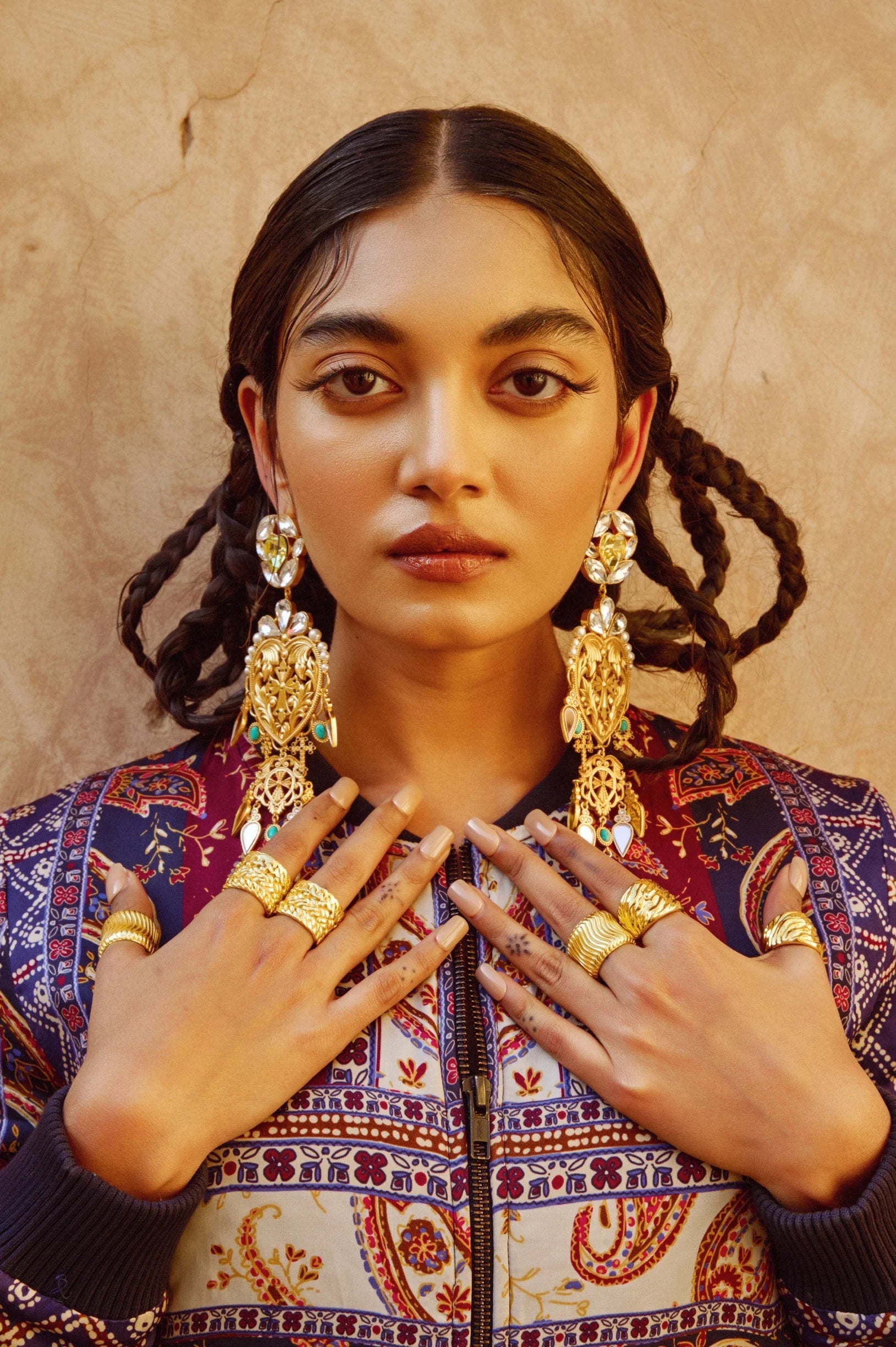 Delicately designed with golden motifs reminiscent of Rajasthan's architectural grandeur, accented by shimmering crystals, stones, and mirrors, echoing the nuanced hues of its cultural heritage with enduring grace.