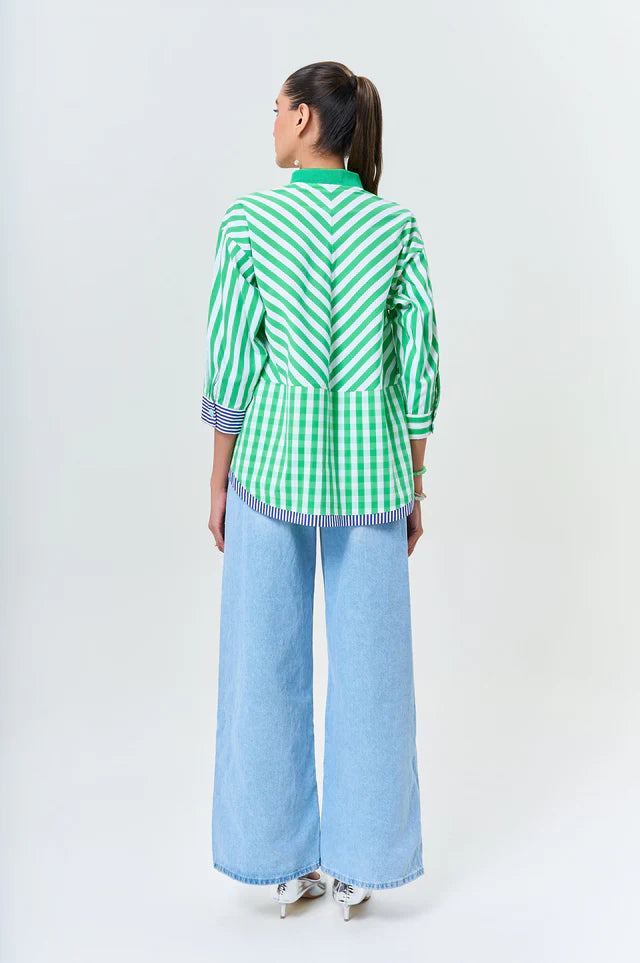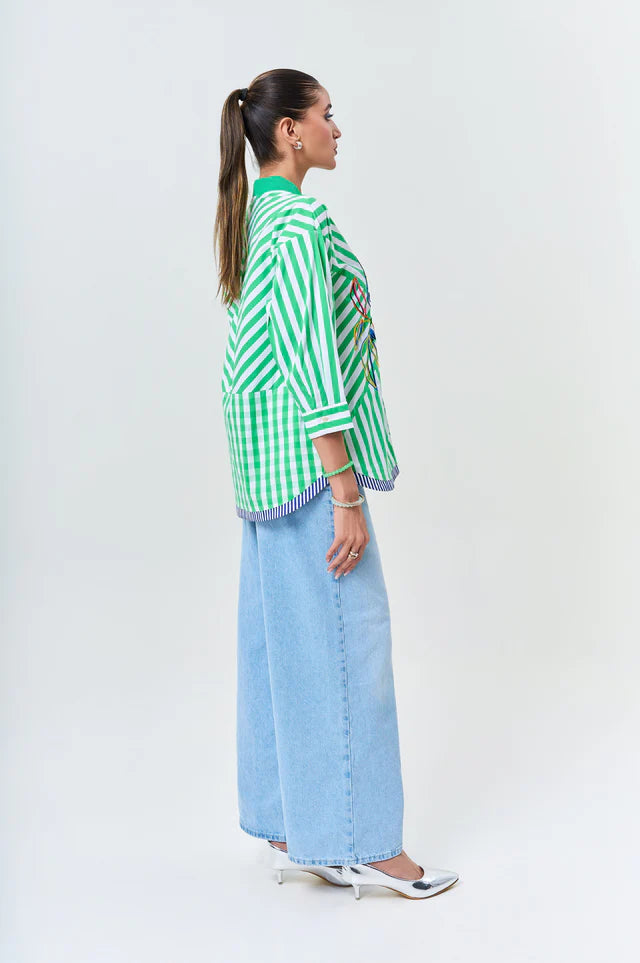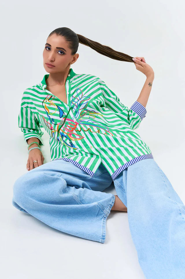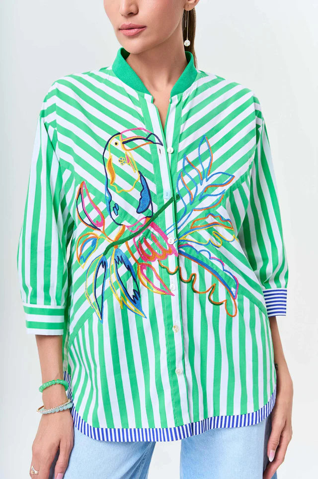 "Matcha" is where tropical energy meets effortless charm. This green and white striped cotton shirt features an intricately embroidered toucan perched amidst vibrant foliage, bringing a playful yet refined touch. The mandarin collar and contrast striped cuffs add a hint of structure, while the relaxed fit keeps it versatile. A fresh pick for breezy days and lively evenings.
