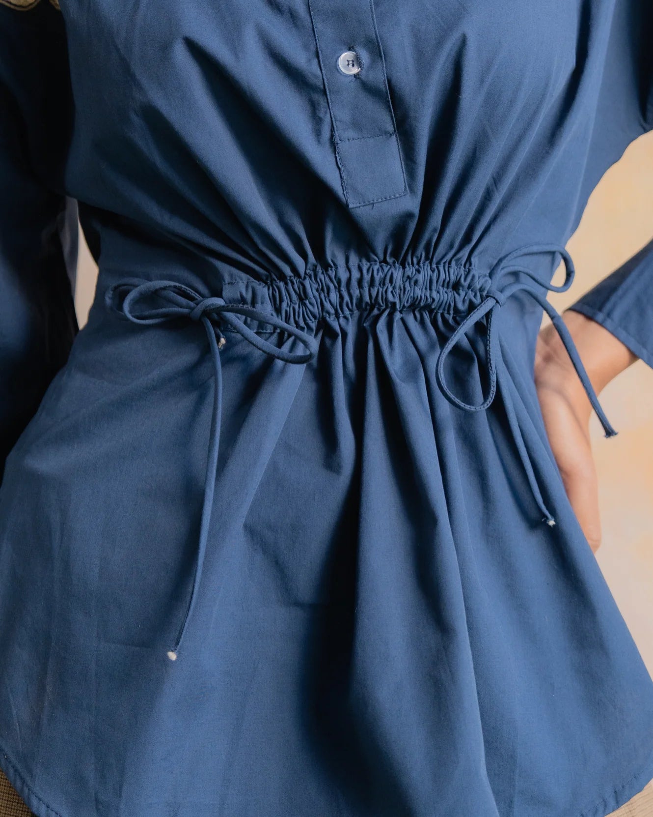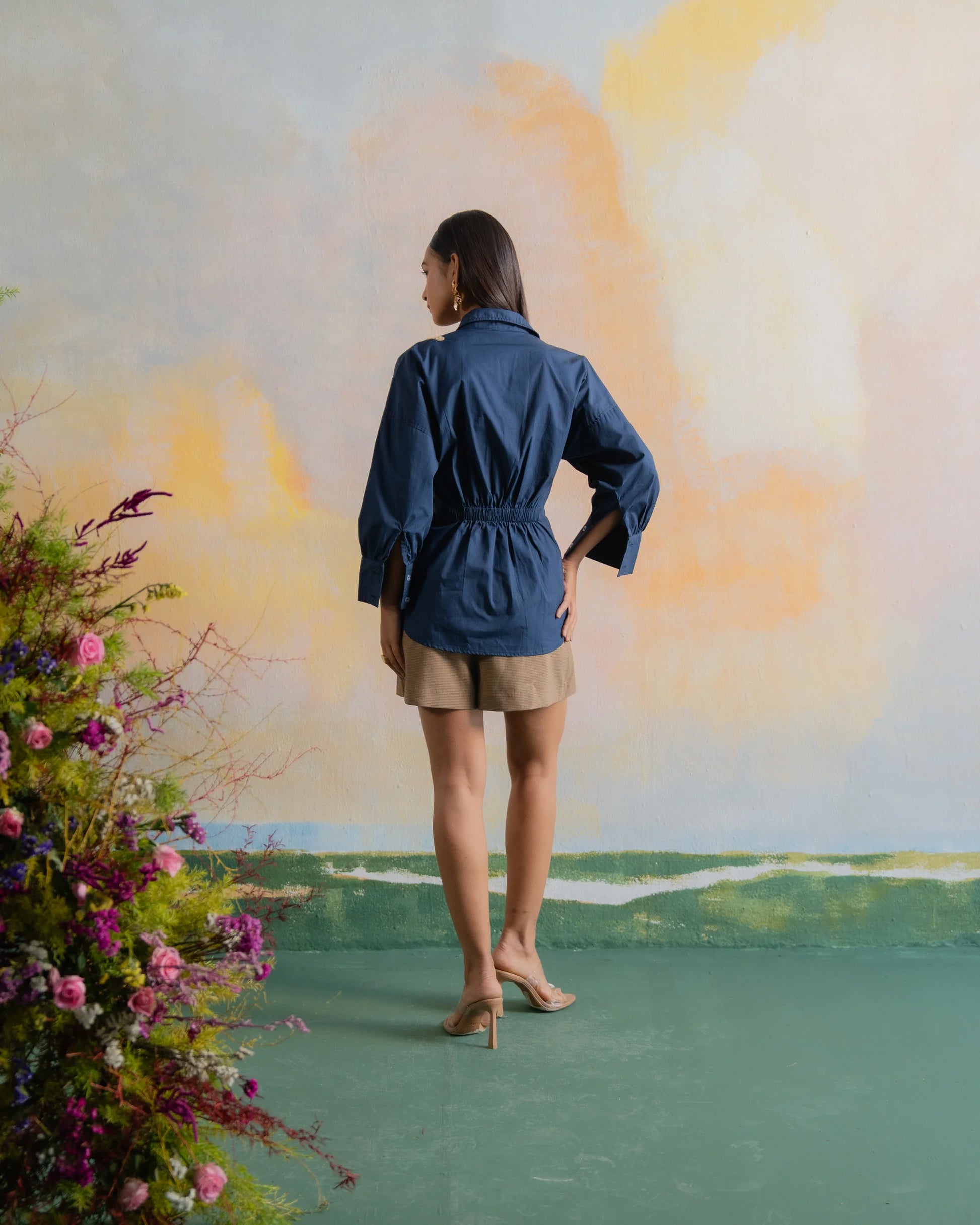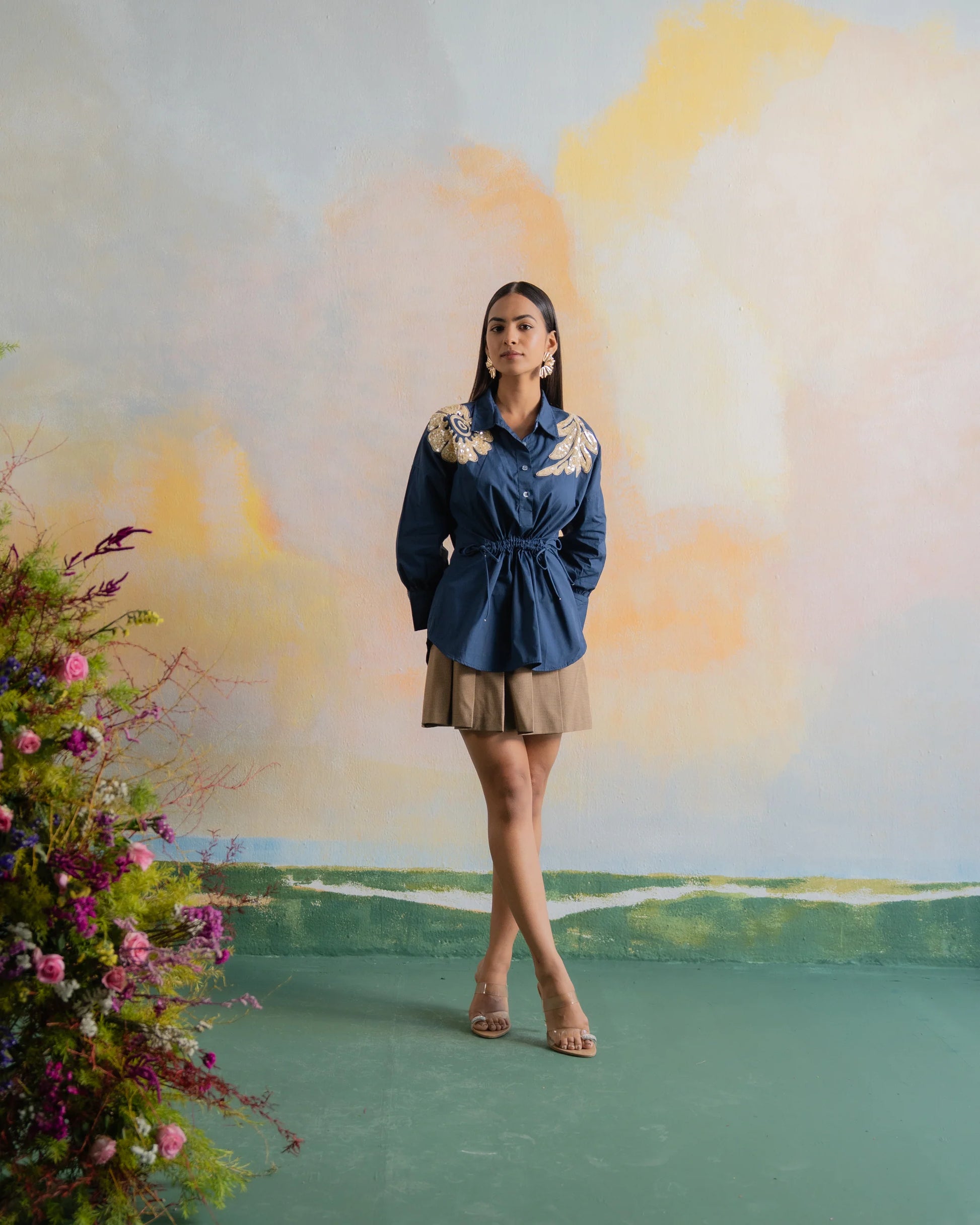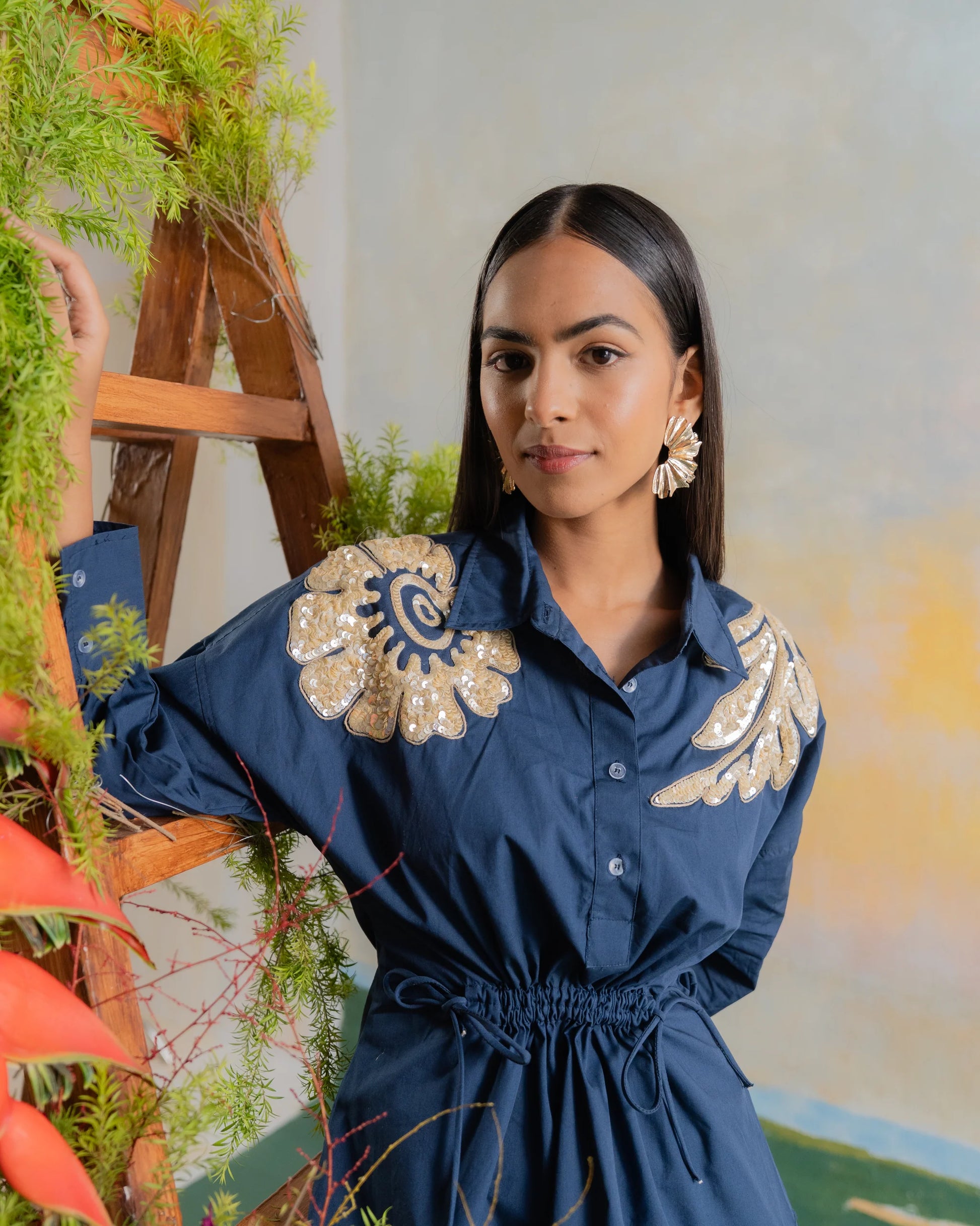 Bold elegance, subtle sparkle. This navy button-down shirt features champagne gold sequin shoulder detailing and a cinched waist—designed to flatter and shine effortlessly.