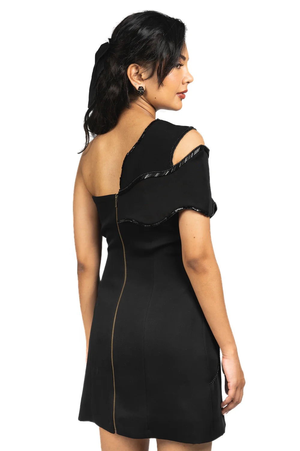 One-shoulder mini dress with wave-shaped paneling and beaded accents. Features asymmetrical draping and sharp tailoring.