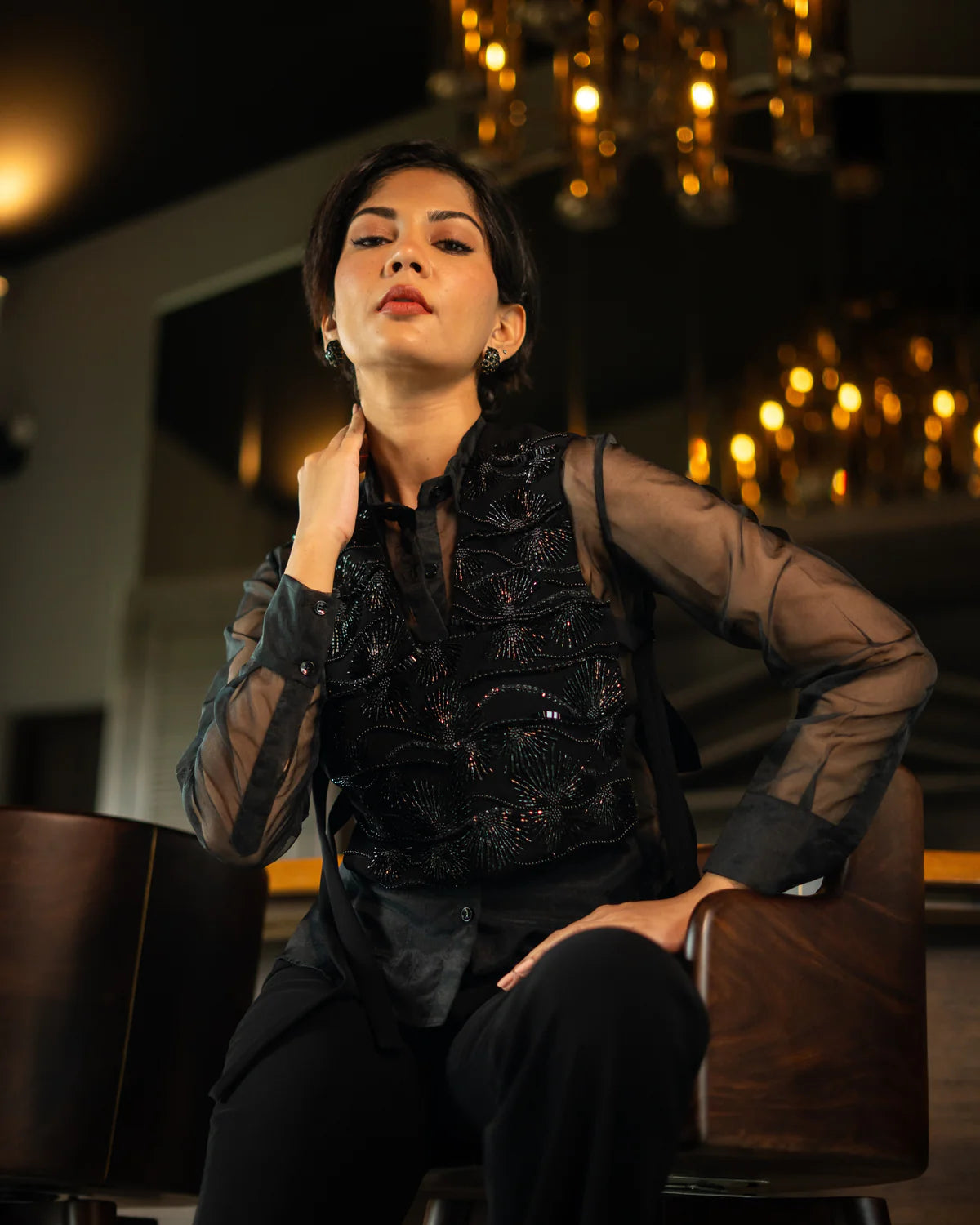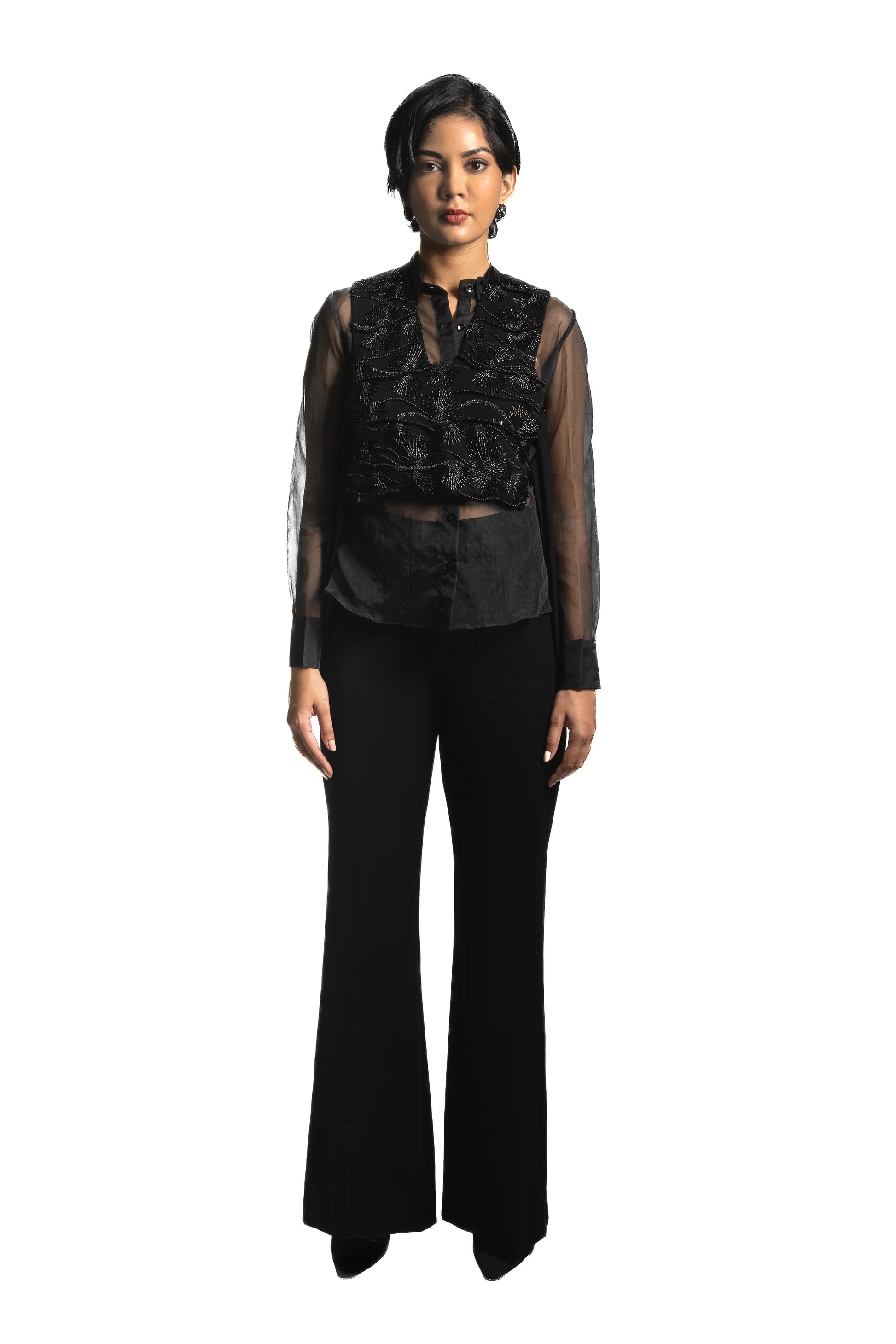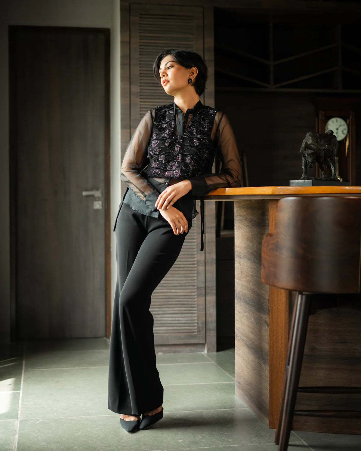 Sleeveless layered vest hand-embellished with radiant beadwork, paired with a sheer full-sleeve organza shirt and flared trousers.