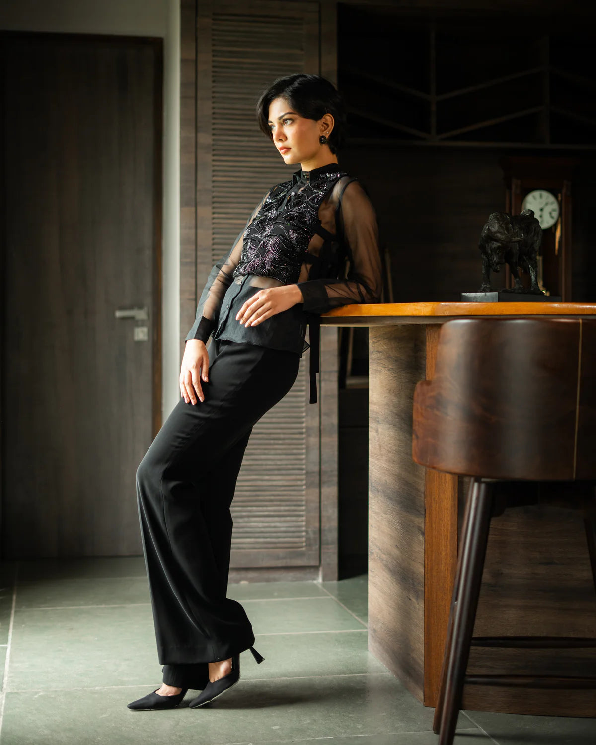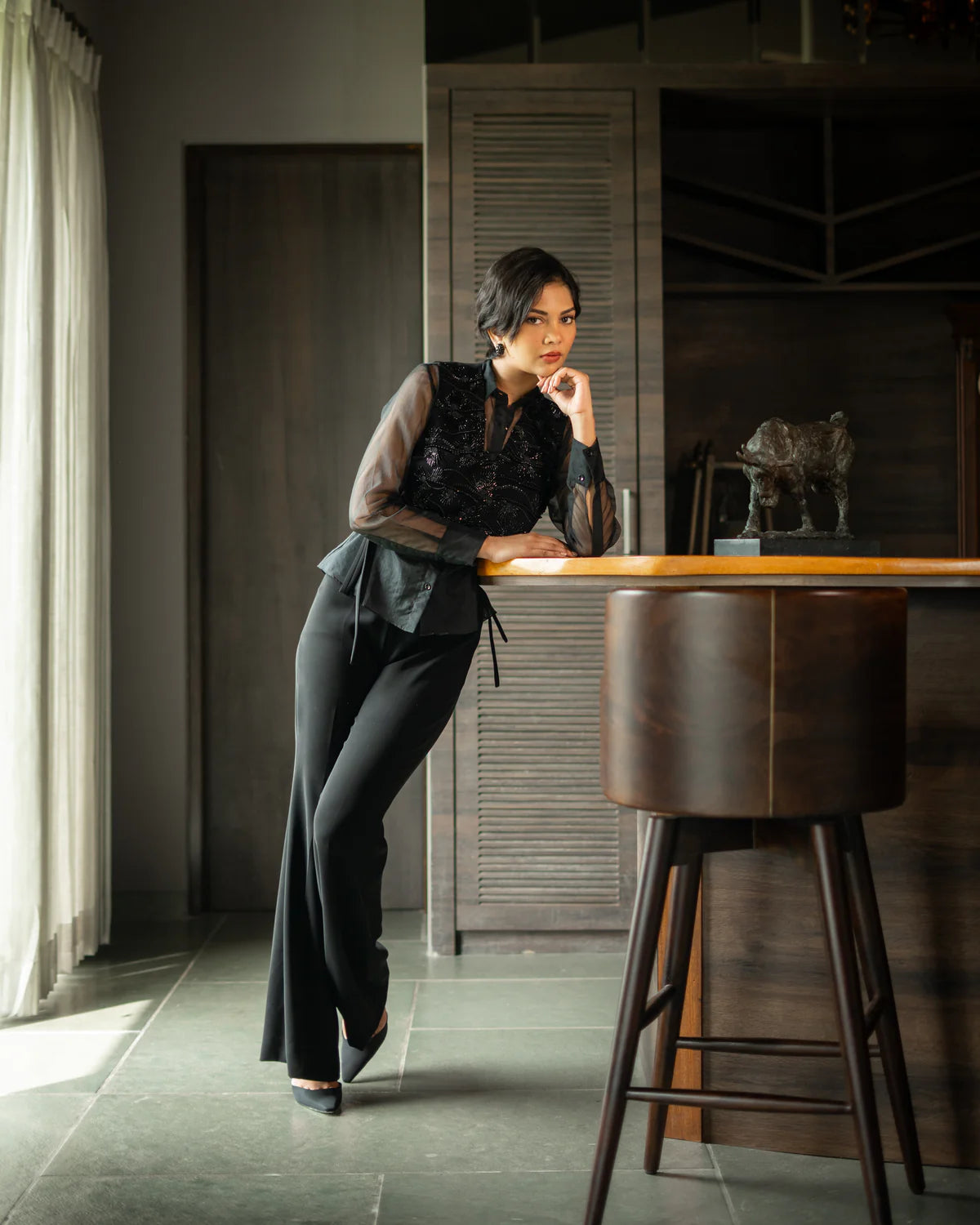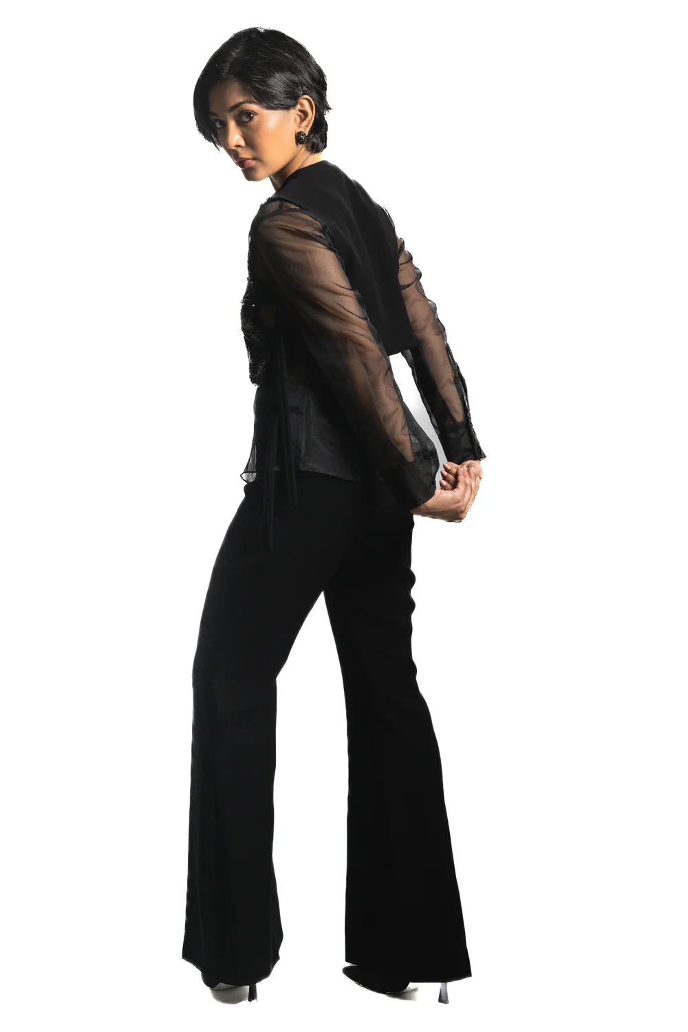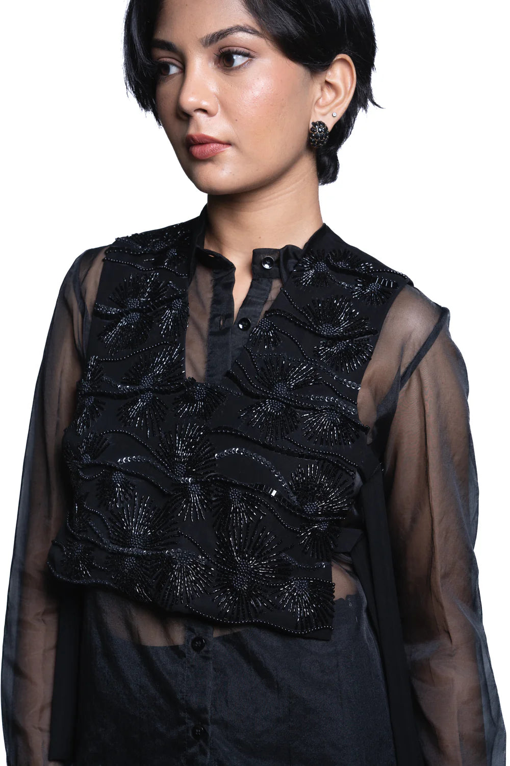 Sleeveless layered vest hand-embellished with radiant beadwork, paired with a sheer full-sleeve organza shirt and flared trousers.