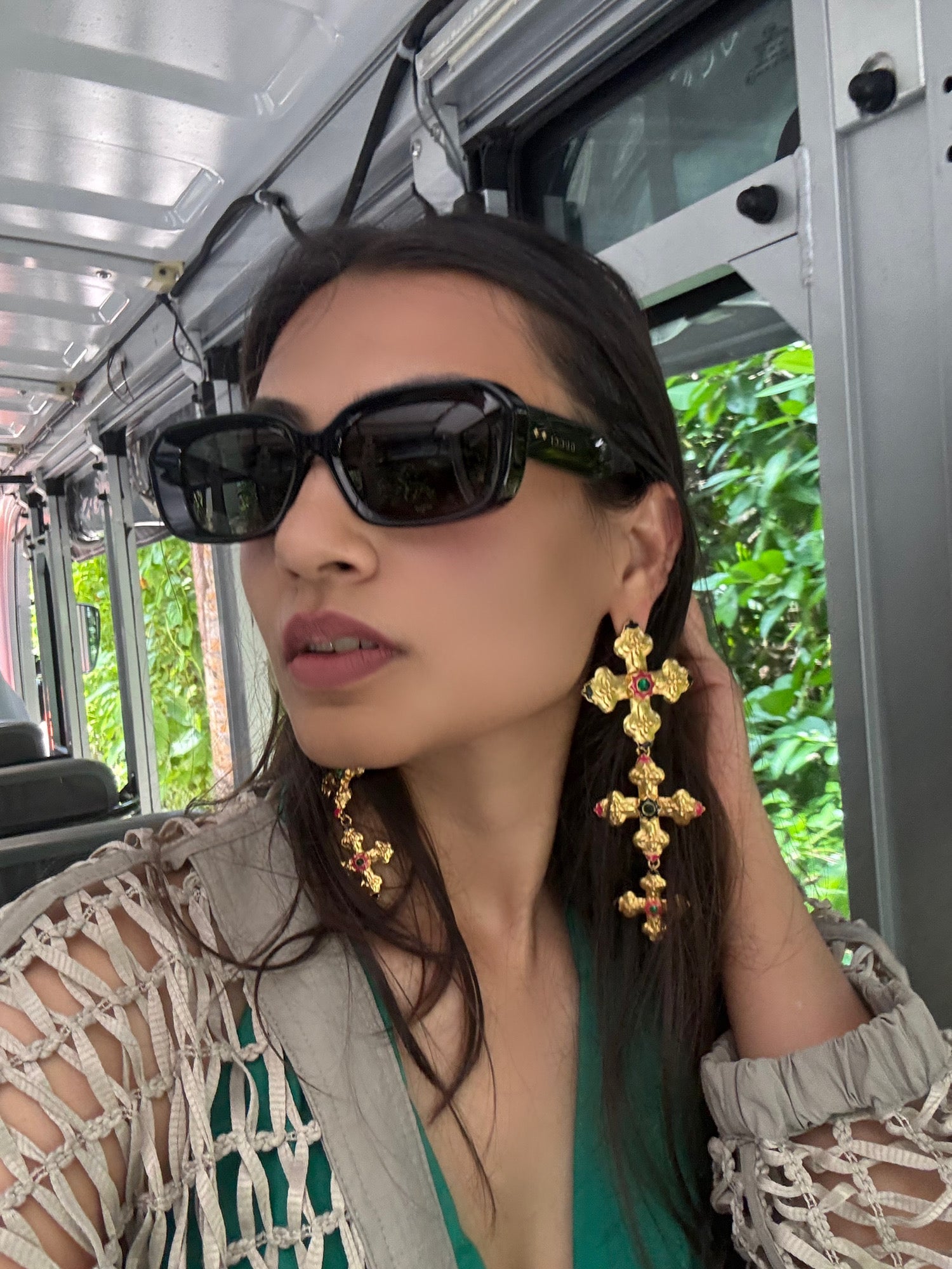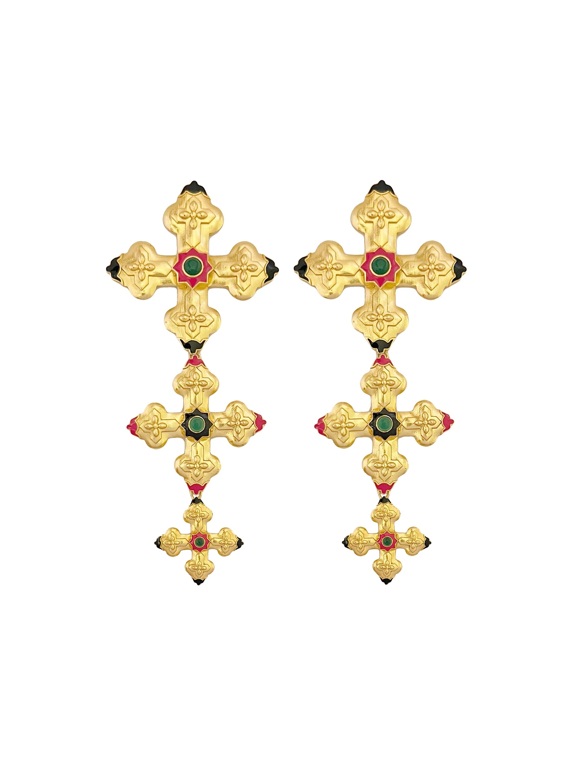 Nouveau cross danglers are danglers with a contemporary design. Crafted with precision, these dangling earrings feature three golden crosses gracefully arranged in descending sizes, creating a captivating visual cascade. Each cross is adorned with subtle enamel details in enchanting black and red hues, adding a touch of sophistication to the overall design. The meticulous craftsmanship not only enhances the aesthetic appeal but also ensures a sense of refined luxury. The golden crosses symbolize a blend of tradition and modernity, while the delicate enamel work introduces a subtle yet vibrant dimension to these earrings. The play of colors, with the richness of black and the warmth of red, creates a perfect balance that complements a variety of styles and occasions.