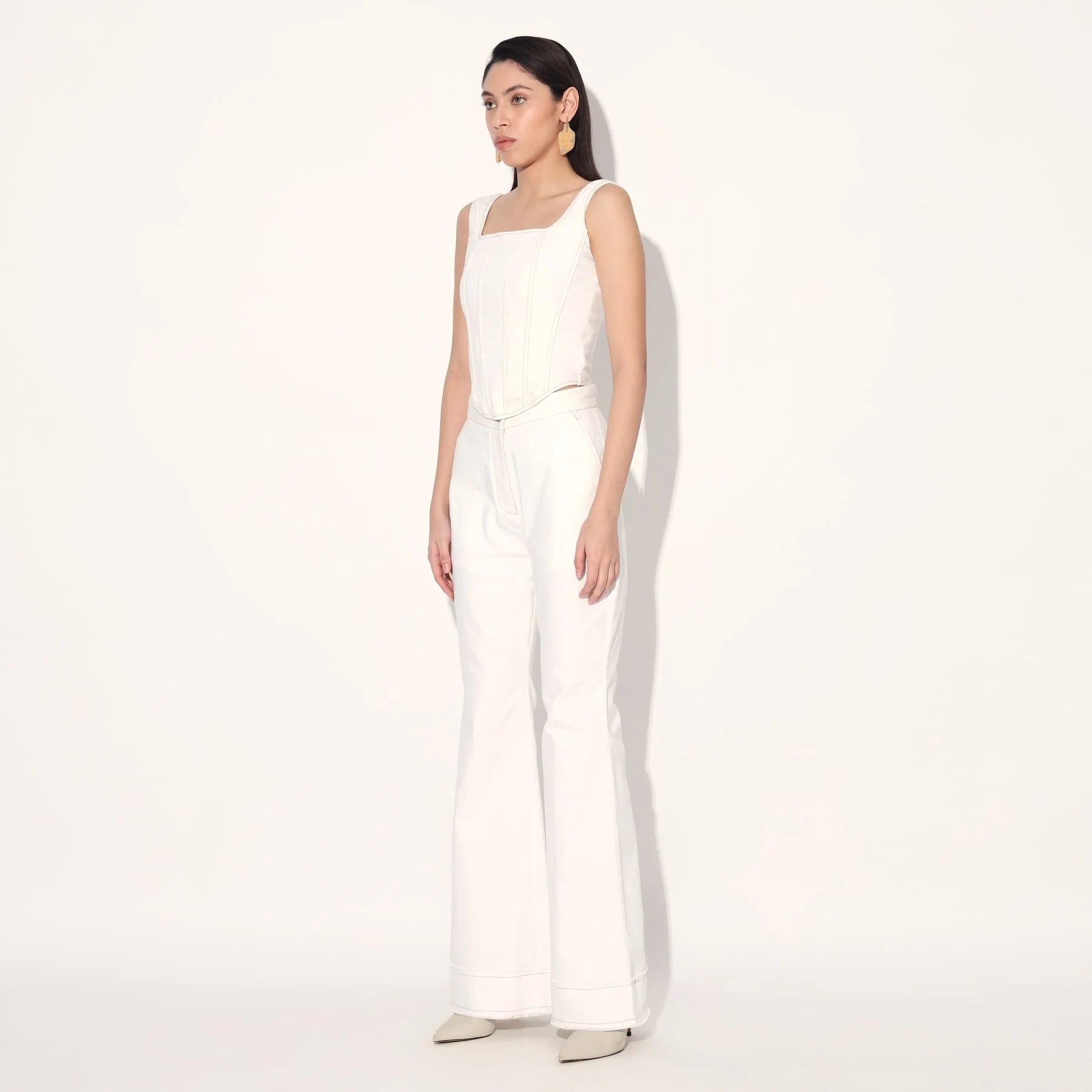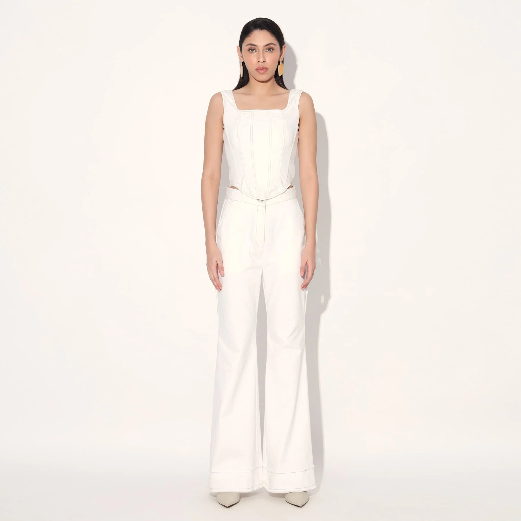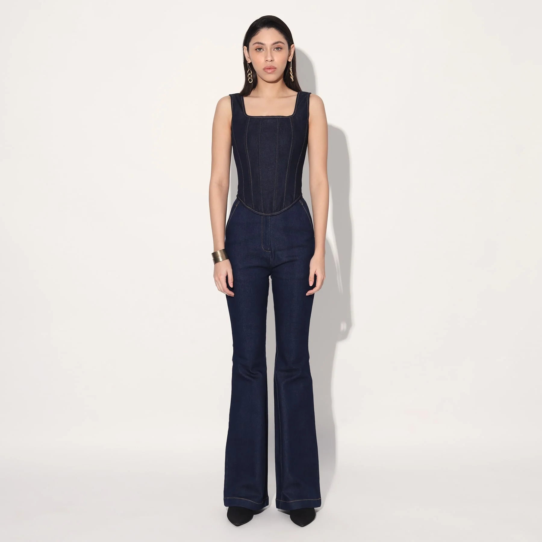 A minimal statement, this set features a structured corset and classic flared jeans in denim.