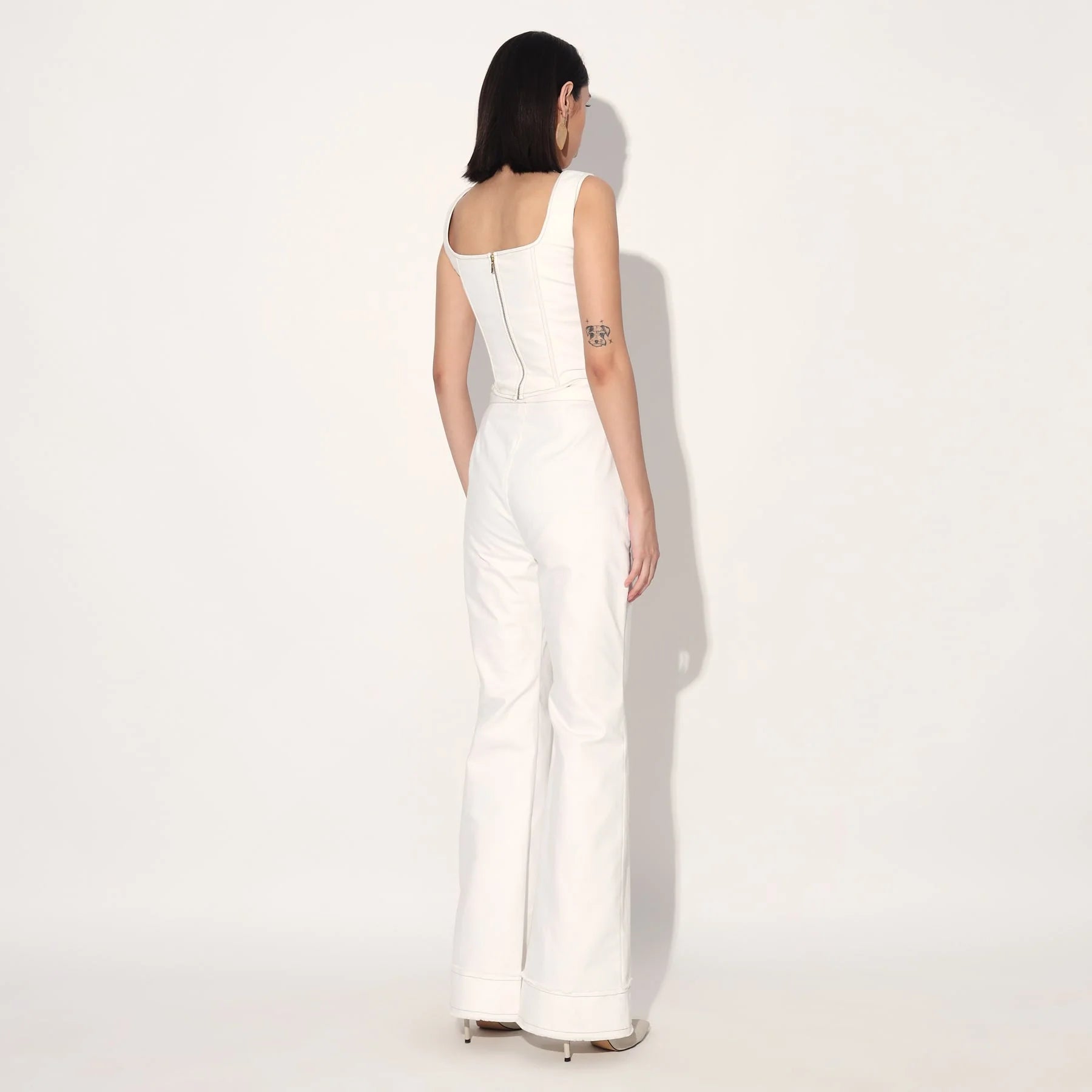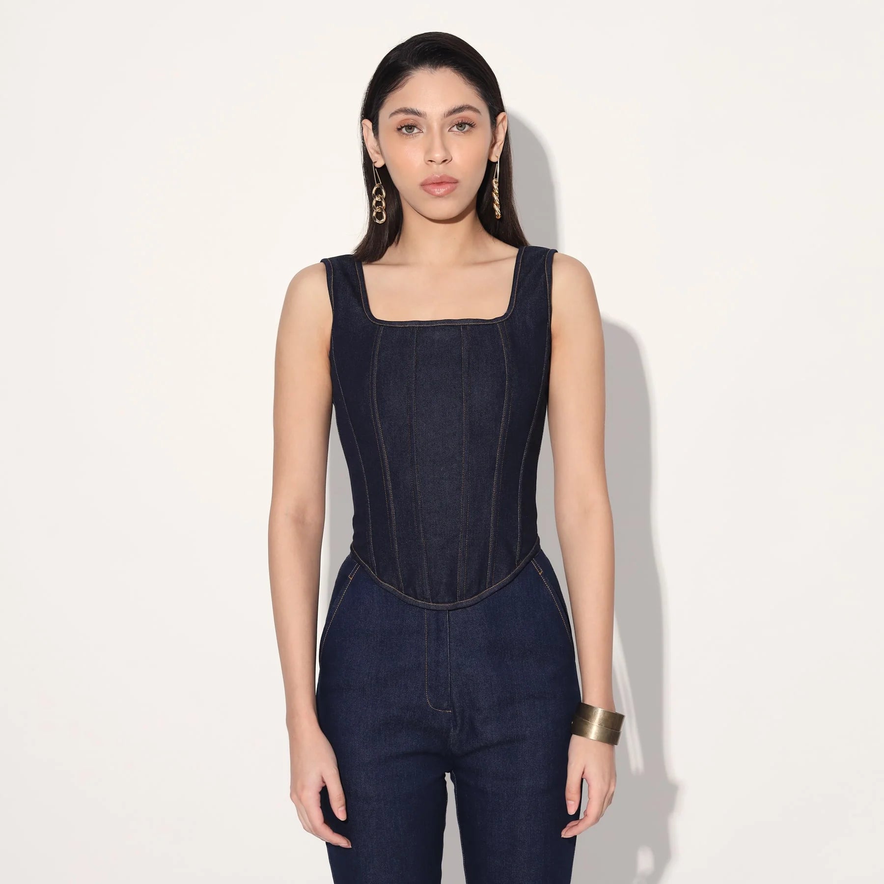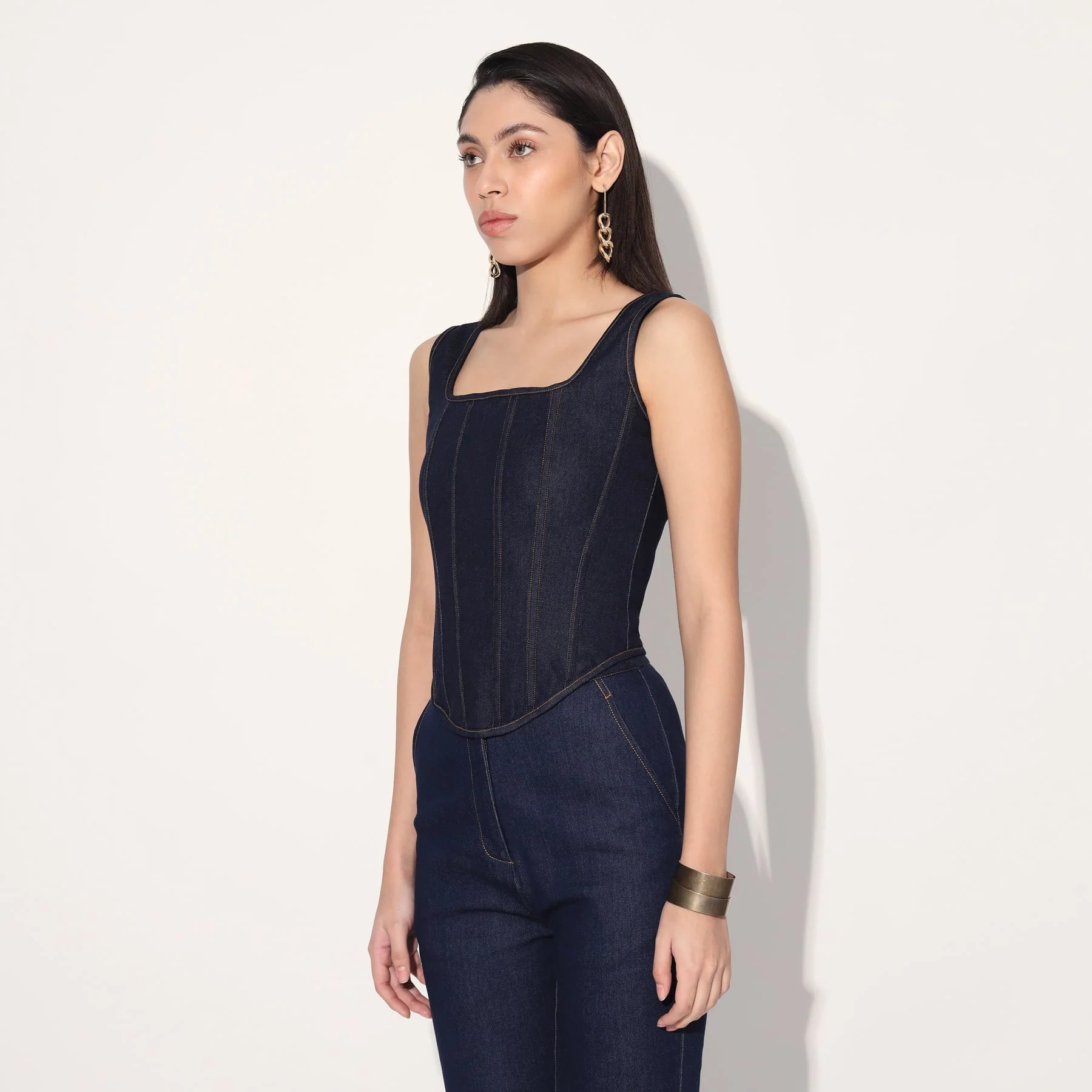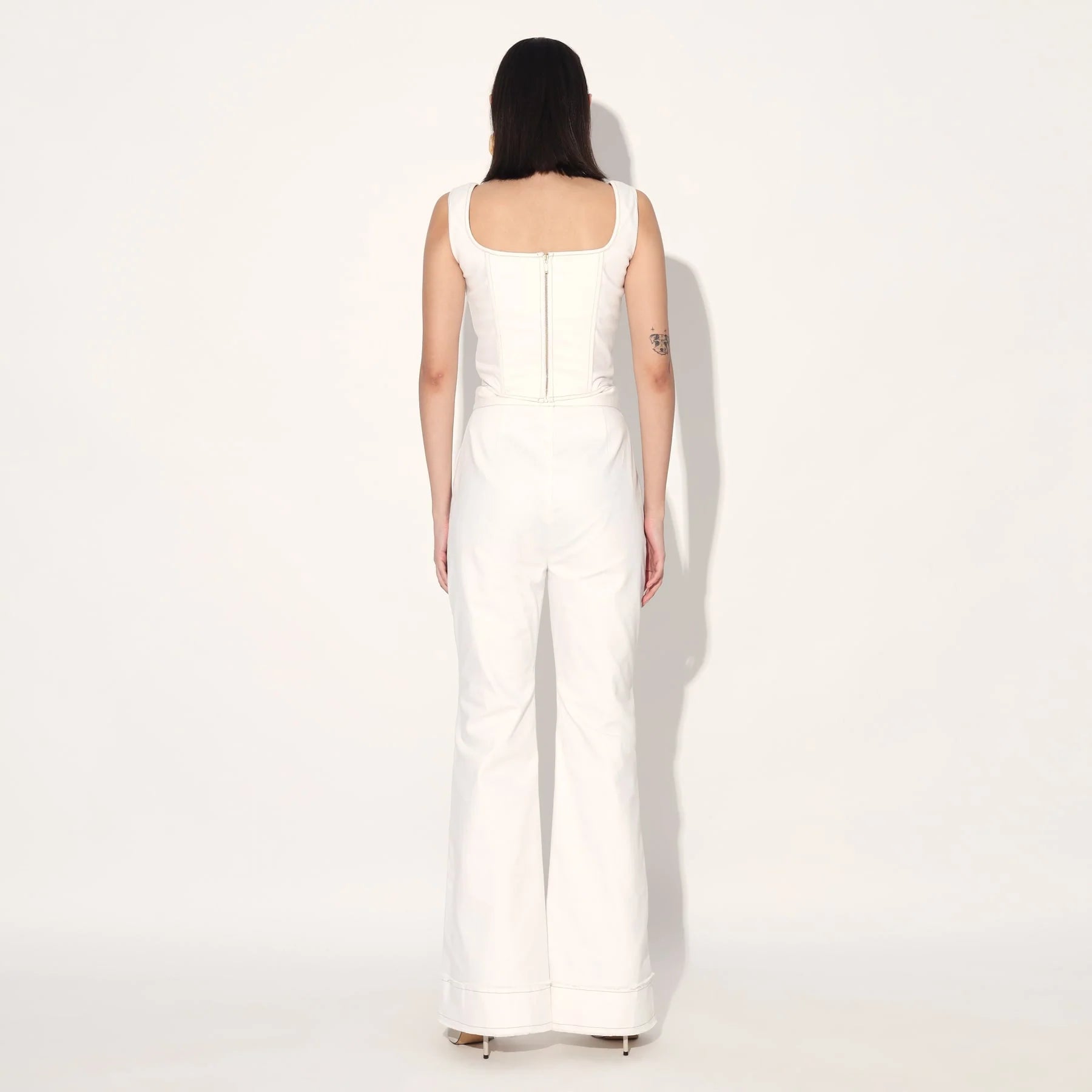 A minimal statement, this set features a structured corset and classic flared jeans in denim.