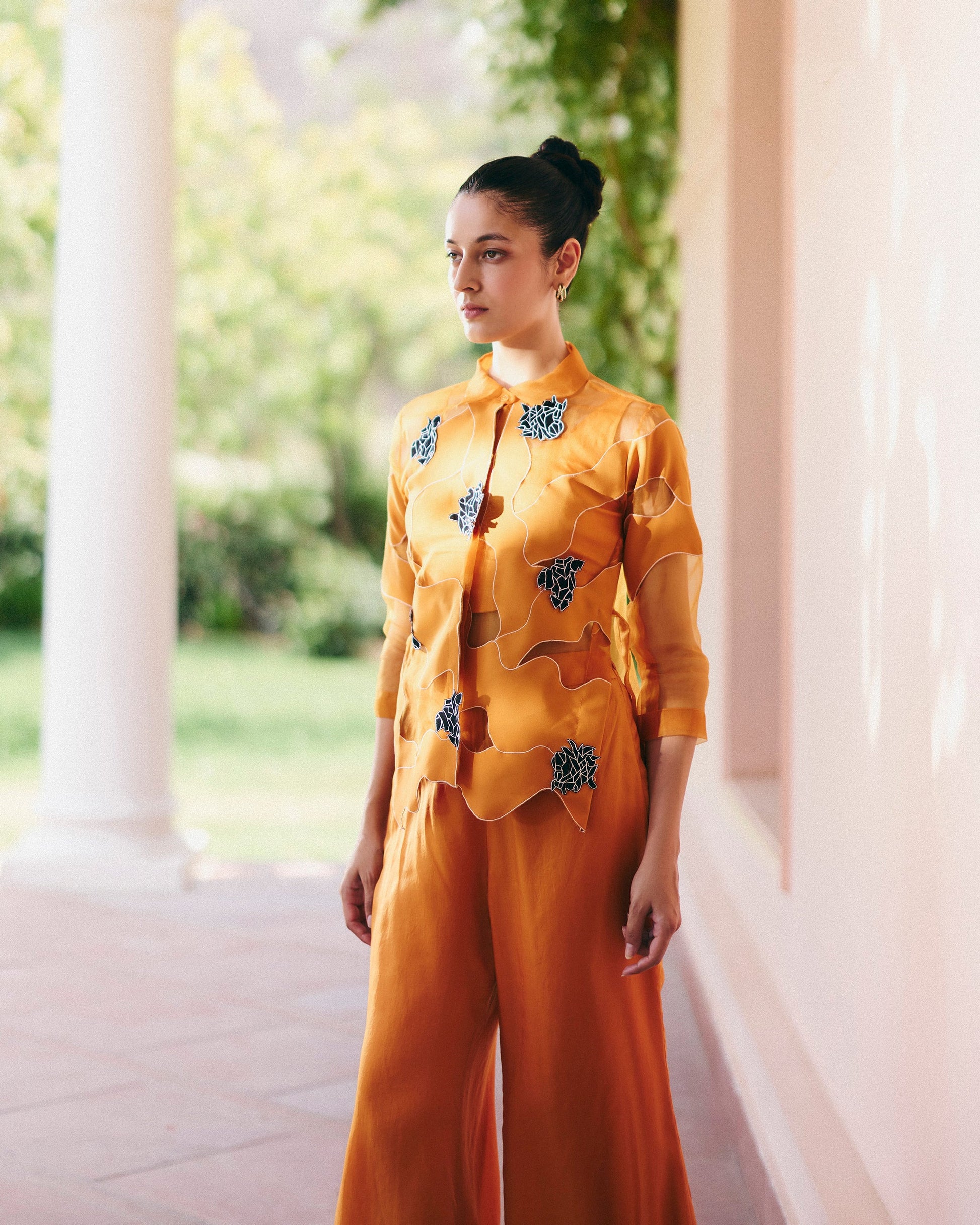 Orange organza swril shirt with origami flowers and boot cut pants