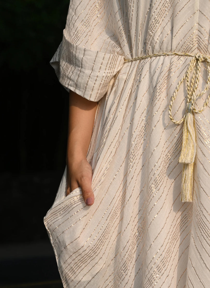 Striped kaftan, patterned like the rays of the morning sun, featuring a v-neck and pockets. Designed to flow with your movements, ideal for a meditative morning of relaxation.