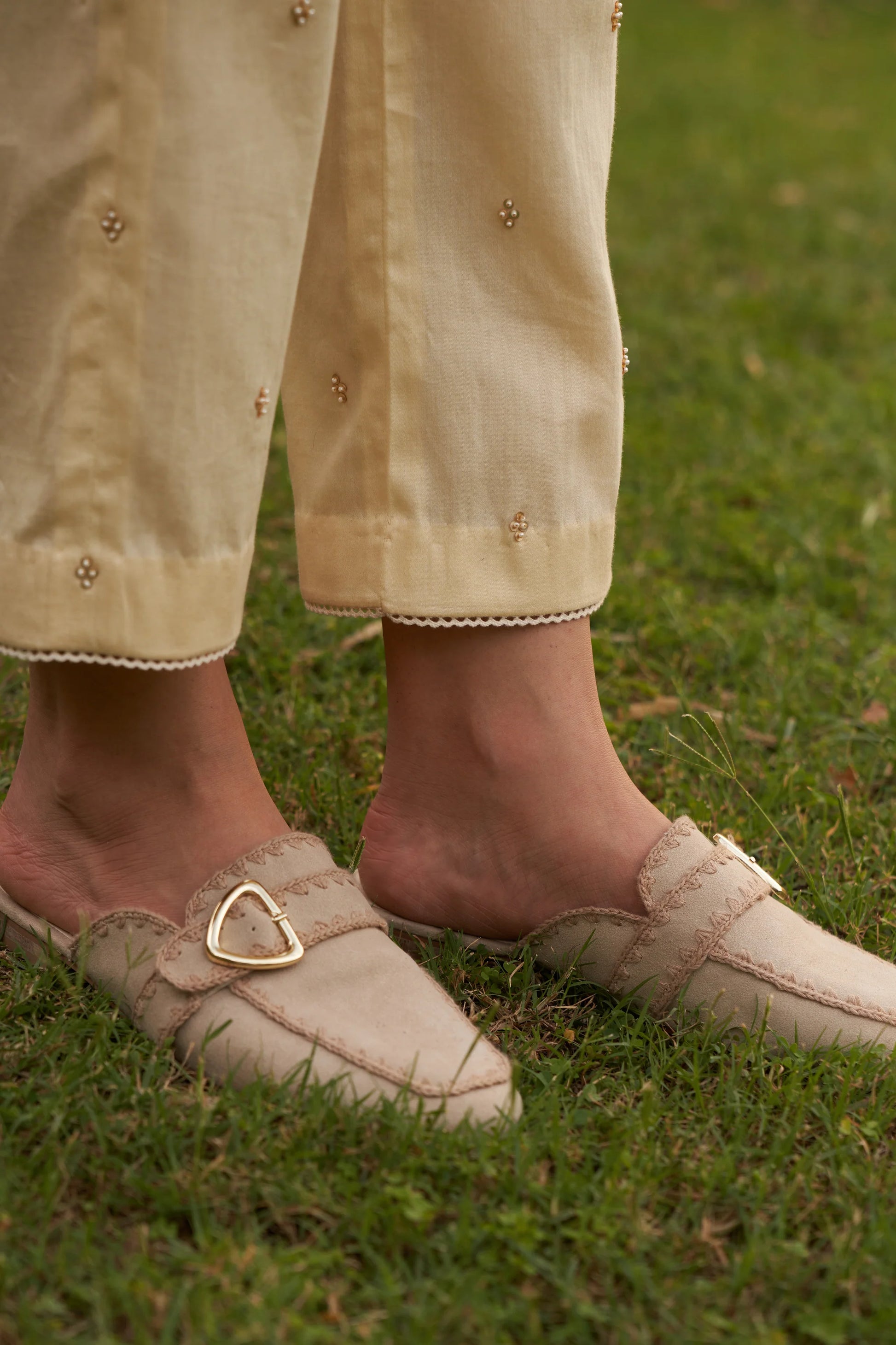 This stunning piece is crafted with intricate appliqué work, hand-embellished with cutdana beads and resham embroidery. The lace finish on the hems adds a delicate, refined touch, creating a timeless and elegant design.