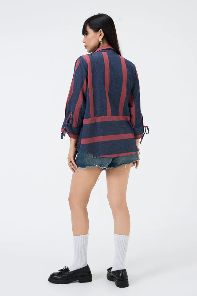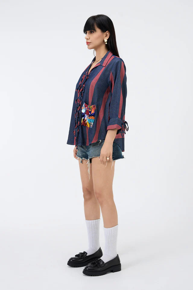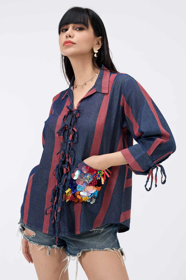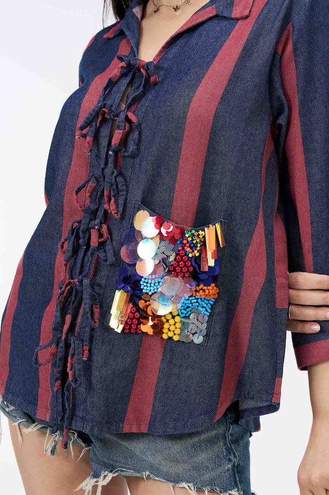 Bold red-and-indigo stripes meet attitude in "Pocket Rocket" — a front tie-up denim shirt with a multicolored sequin pocket that brings the drama. Made in soft cotton denim, it's your go-to for evening hangouts, gallery hops, or that unexpected party plan.