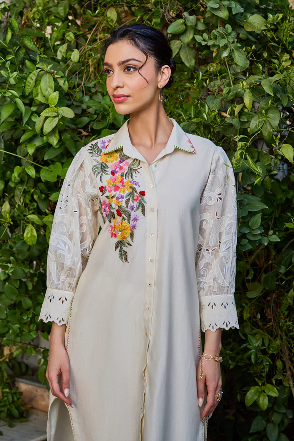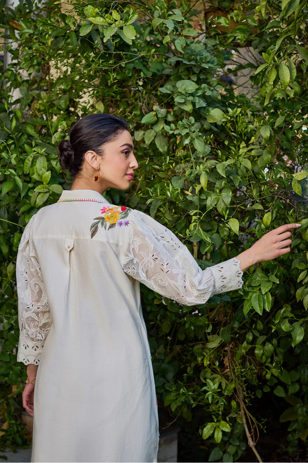 A collared button-down coord set, featuring a hand-embroidered motif on one side and appliqué work on the sleeves only to adorn a magnificent you. Complemented by slim-fit pants adorned with matching cutwork on the hemline, this ensemble tastefully brings together the best of timeless charm and new-age chic.