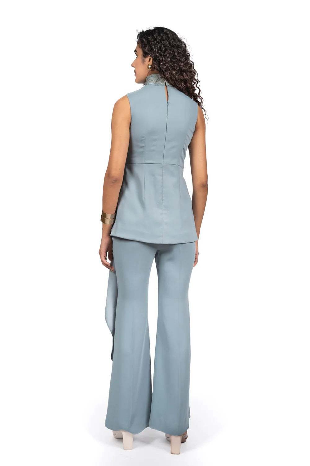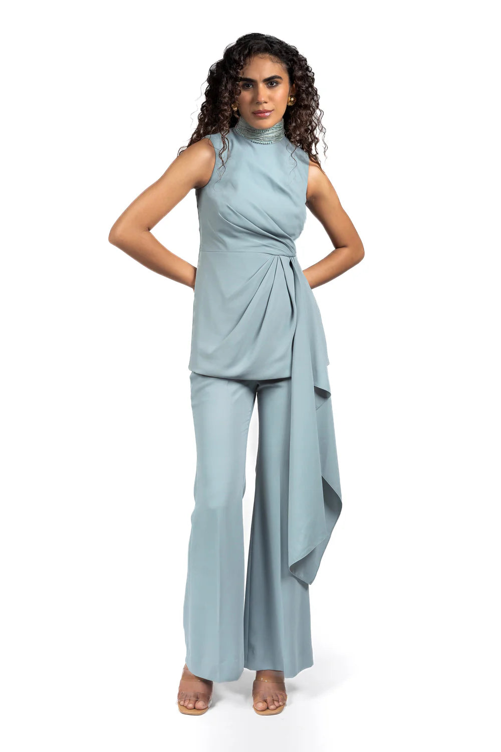 Draped top detailed with a hand-embroidered high collar and an asymmetric waterfall overlay gathered at the waist. Styled with flared trousers.