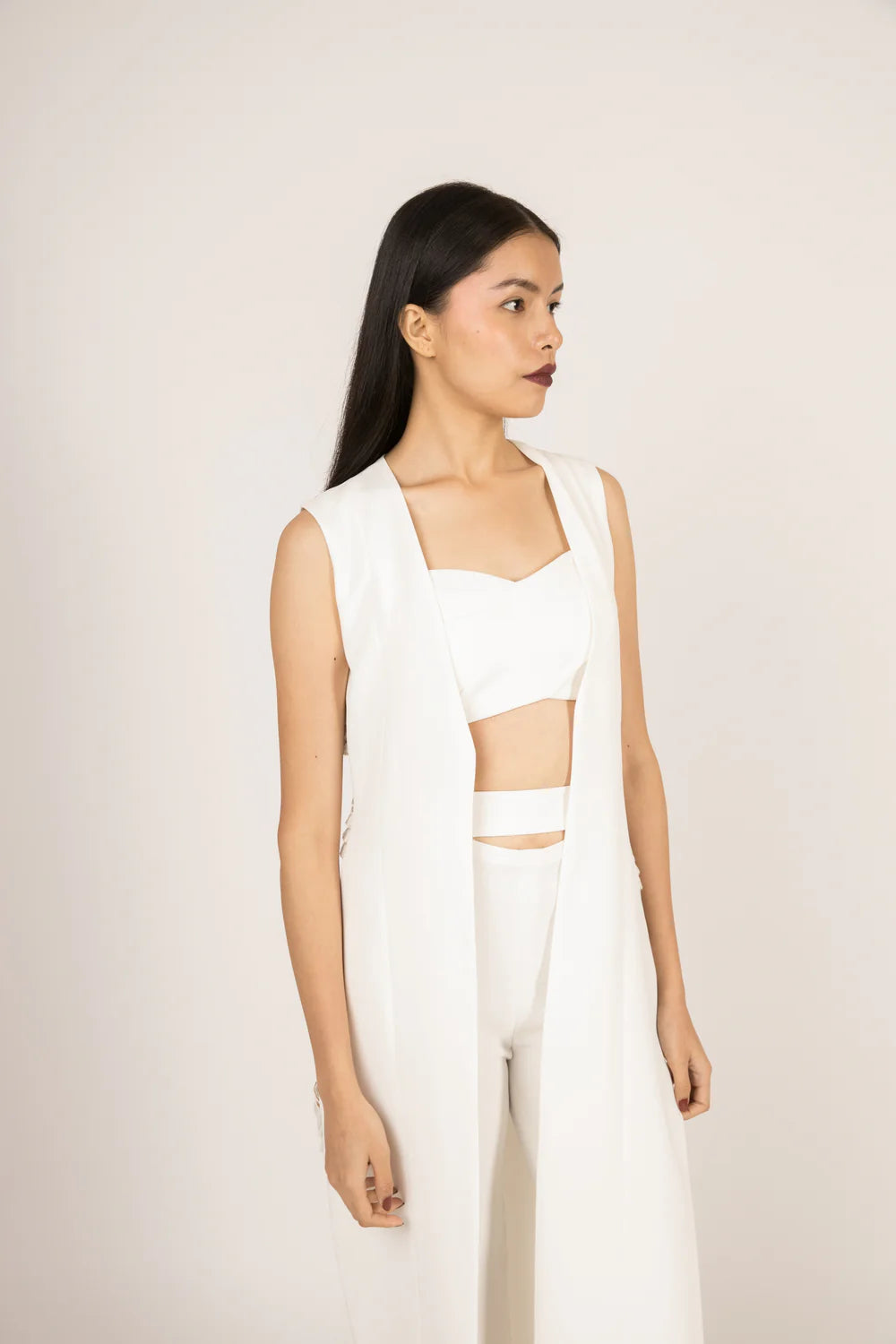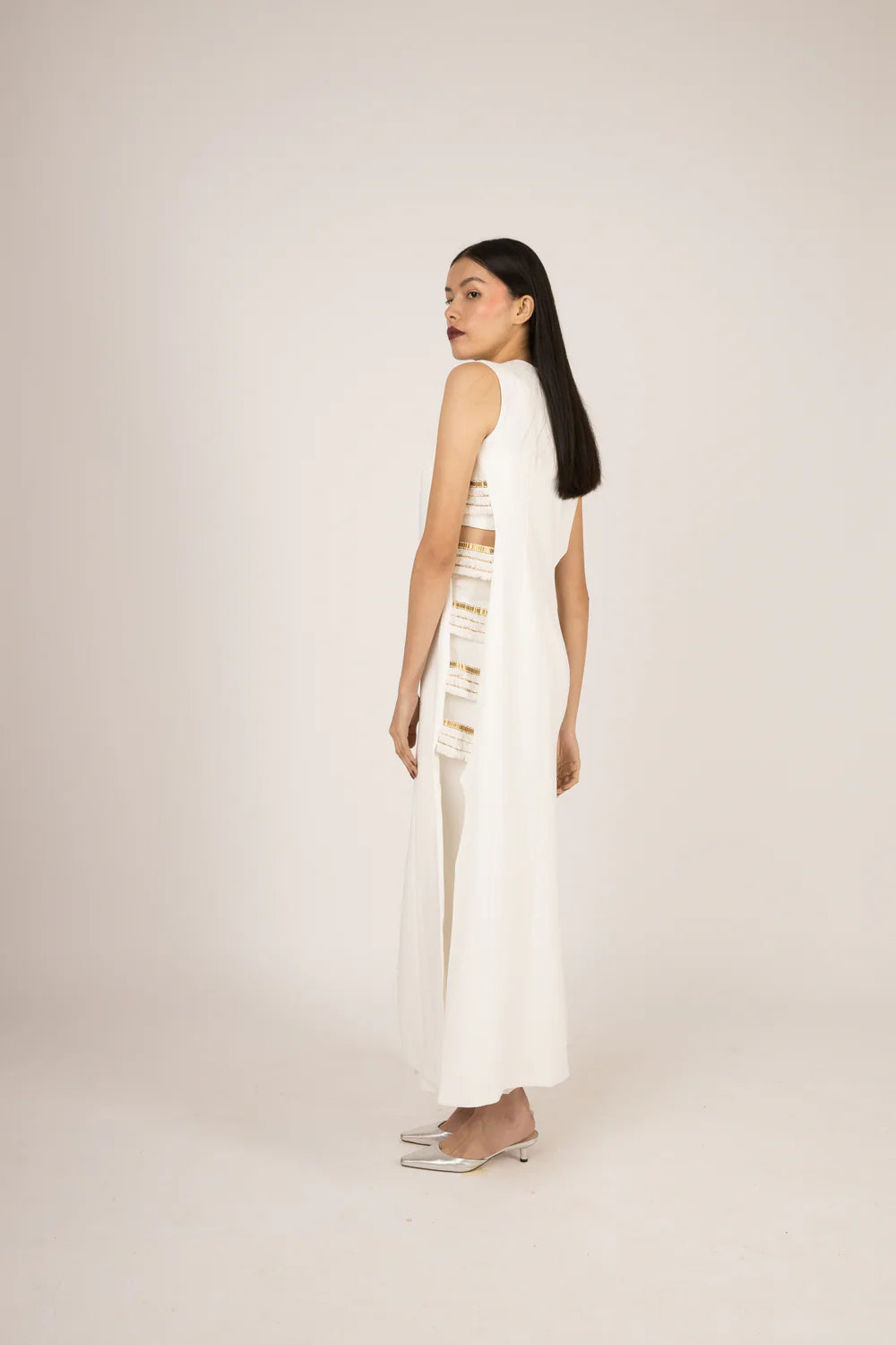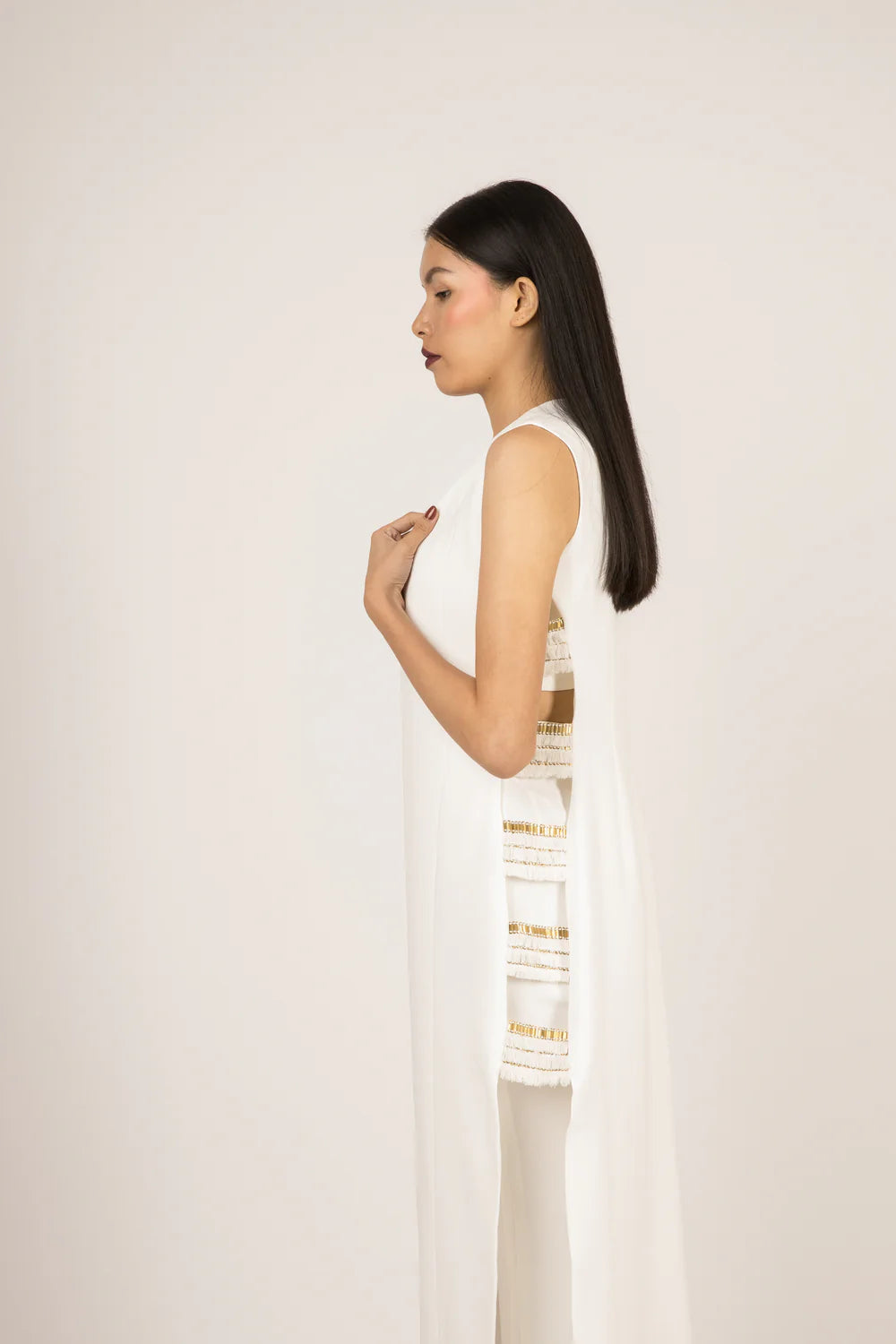 Sleeveless floor-length jacket with detailed side panels embroidered with tonal thread and metallic gold. It is layered over a draped bustier and straight-cut trousers.