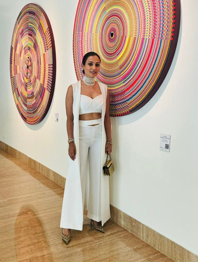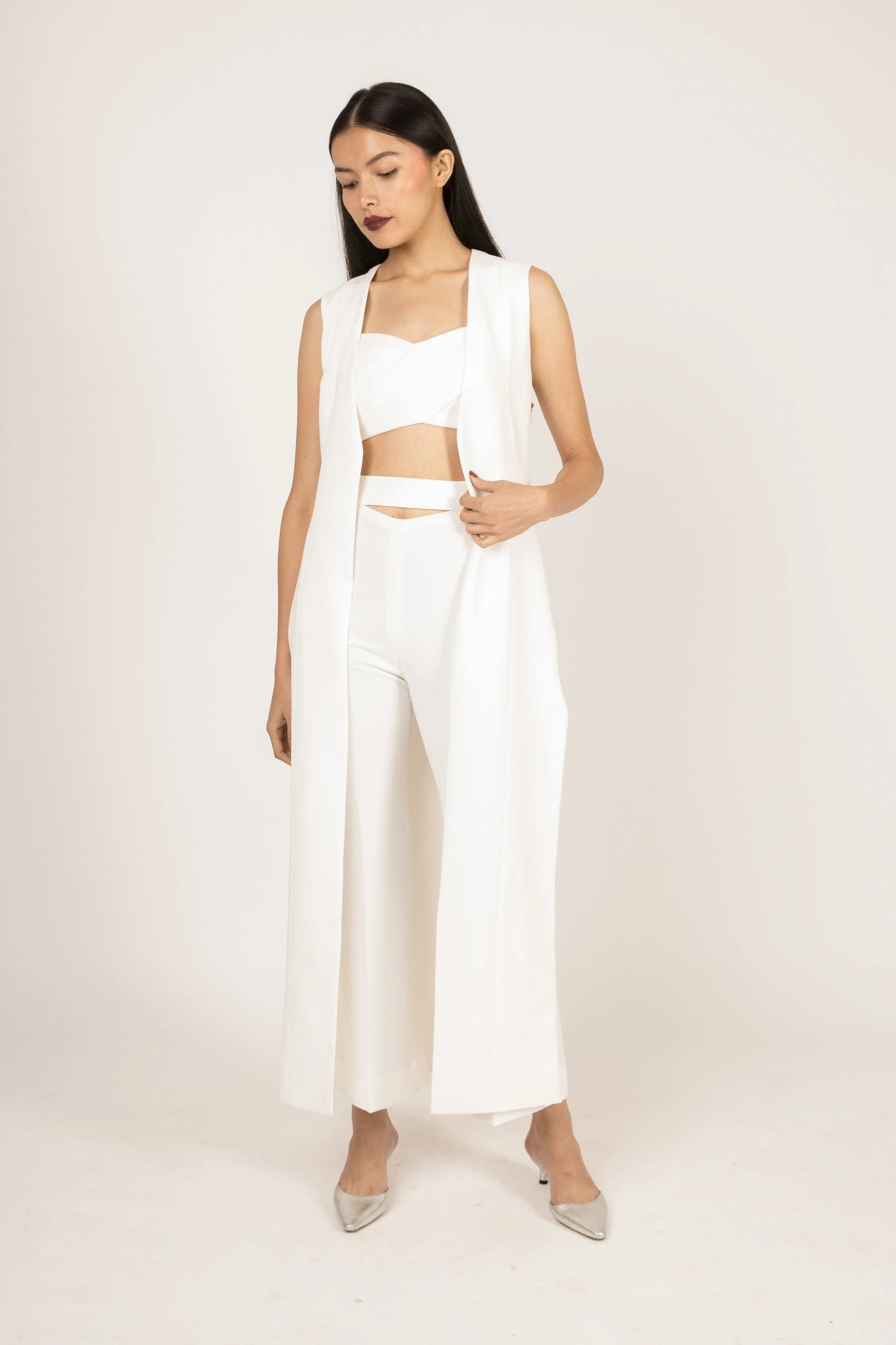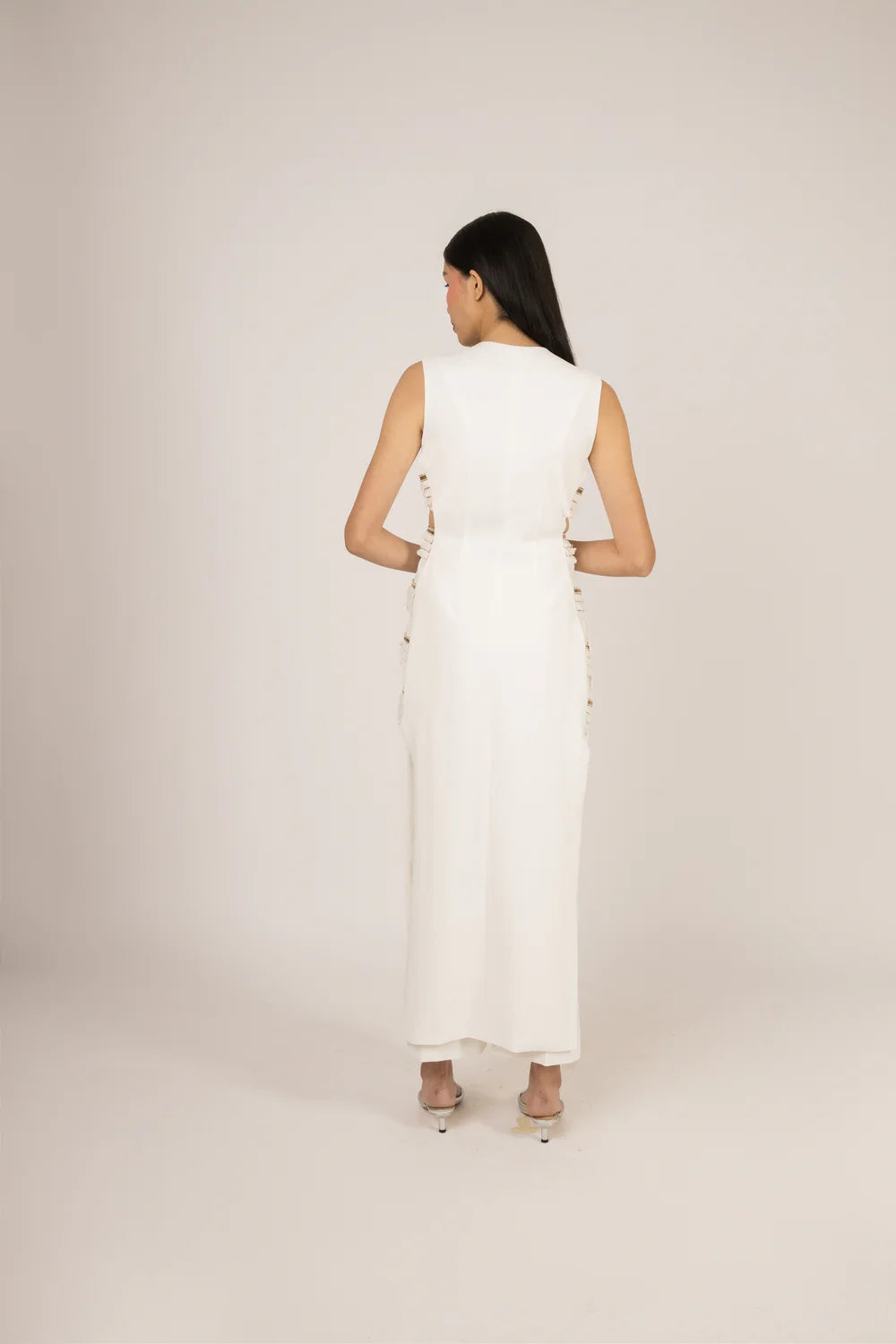 Sleeveless floor-length jacket with detailed side panels embroidered with tonal thread and metallic gold. It is layered over a draped bustier and straight-cut trousers.