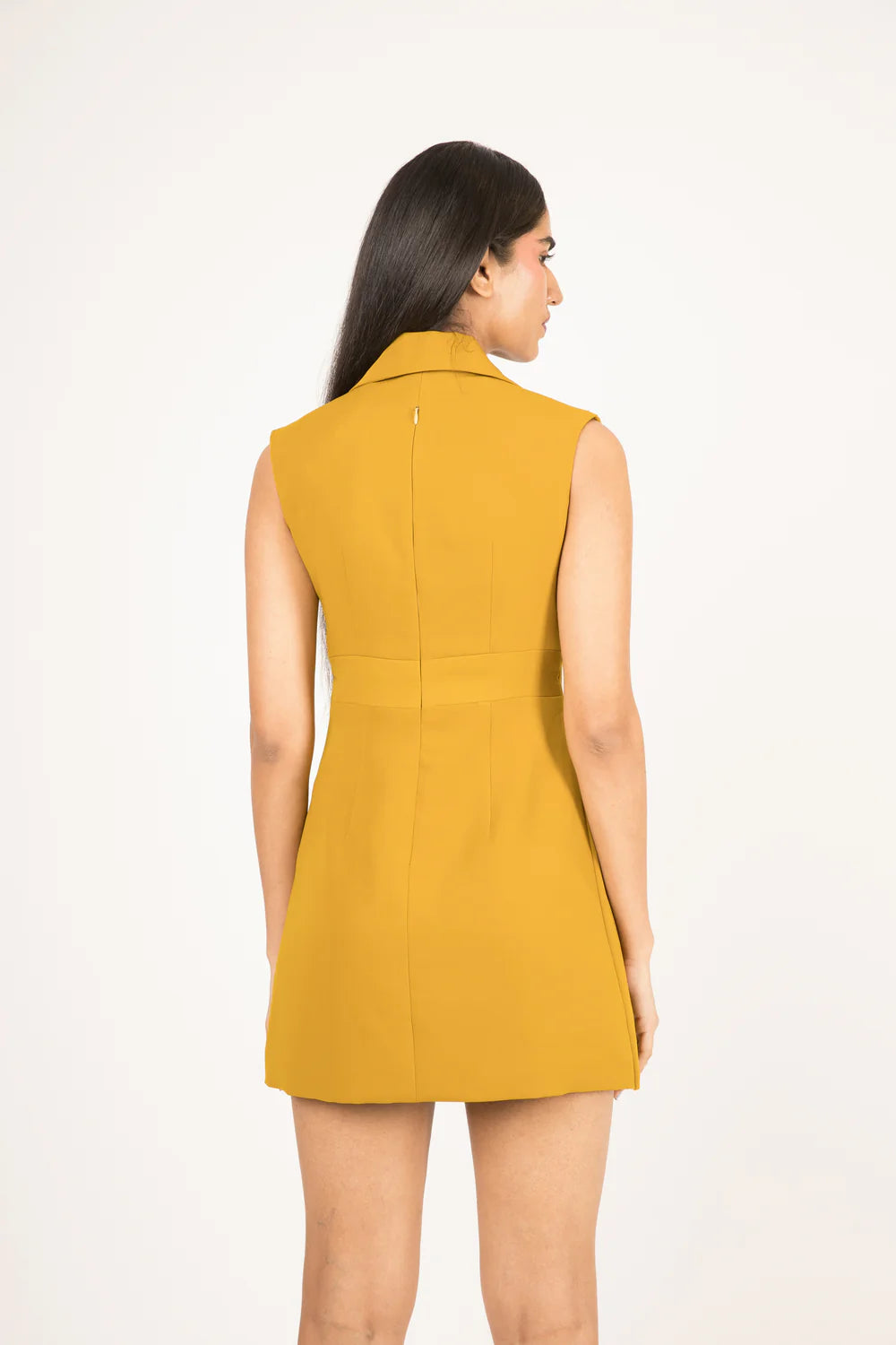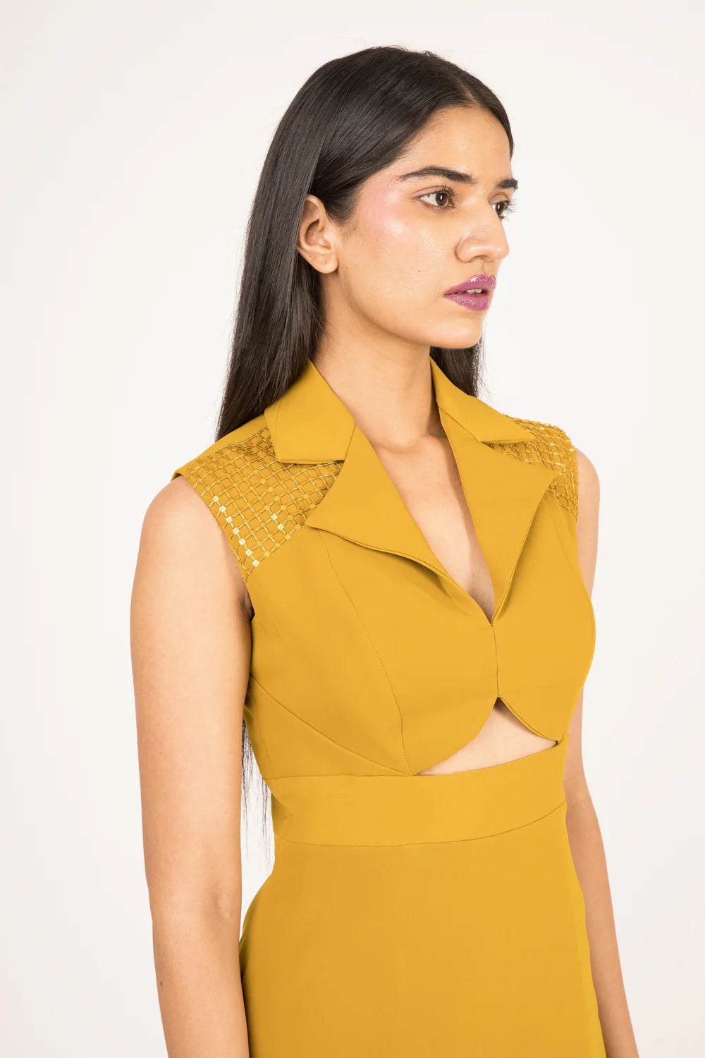 Mini dress with a sharp open collar, waist cutout, and intricate hand-embroidered detailing on the shoulders.