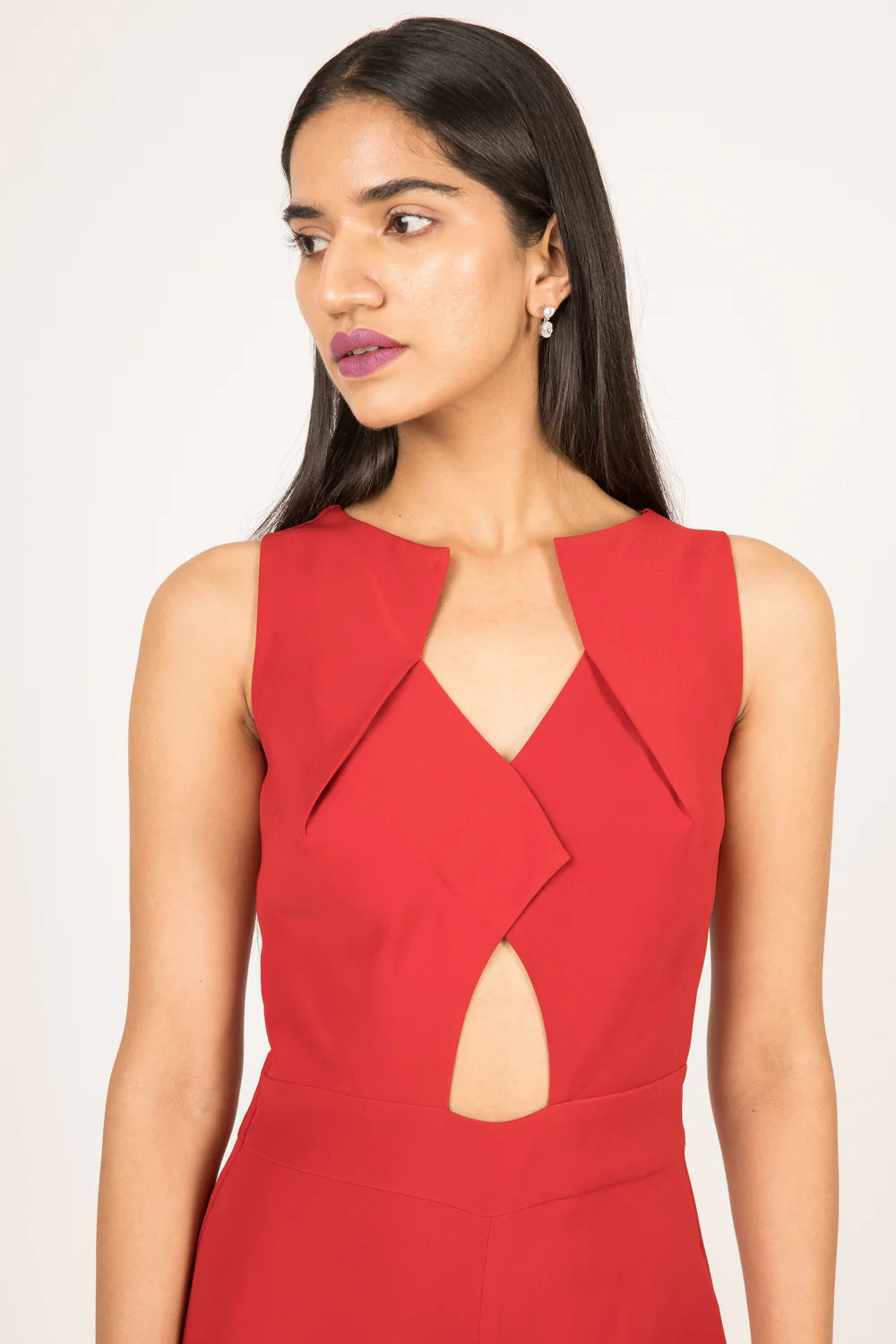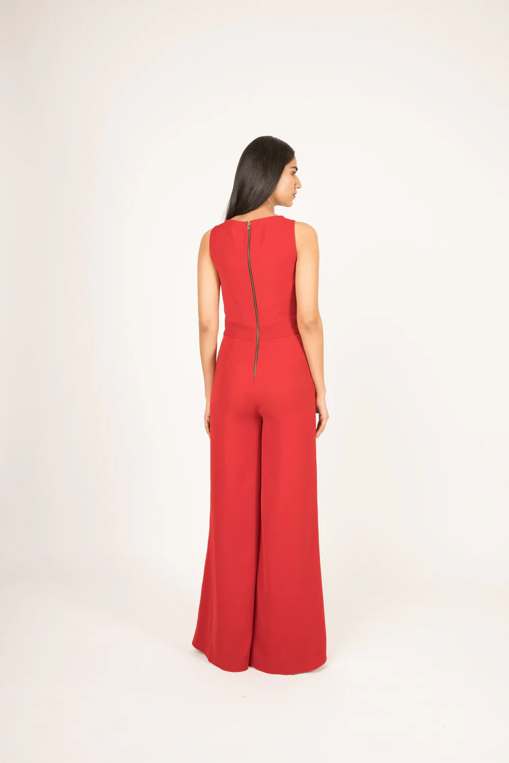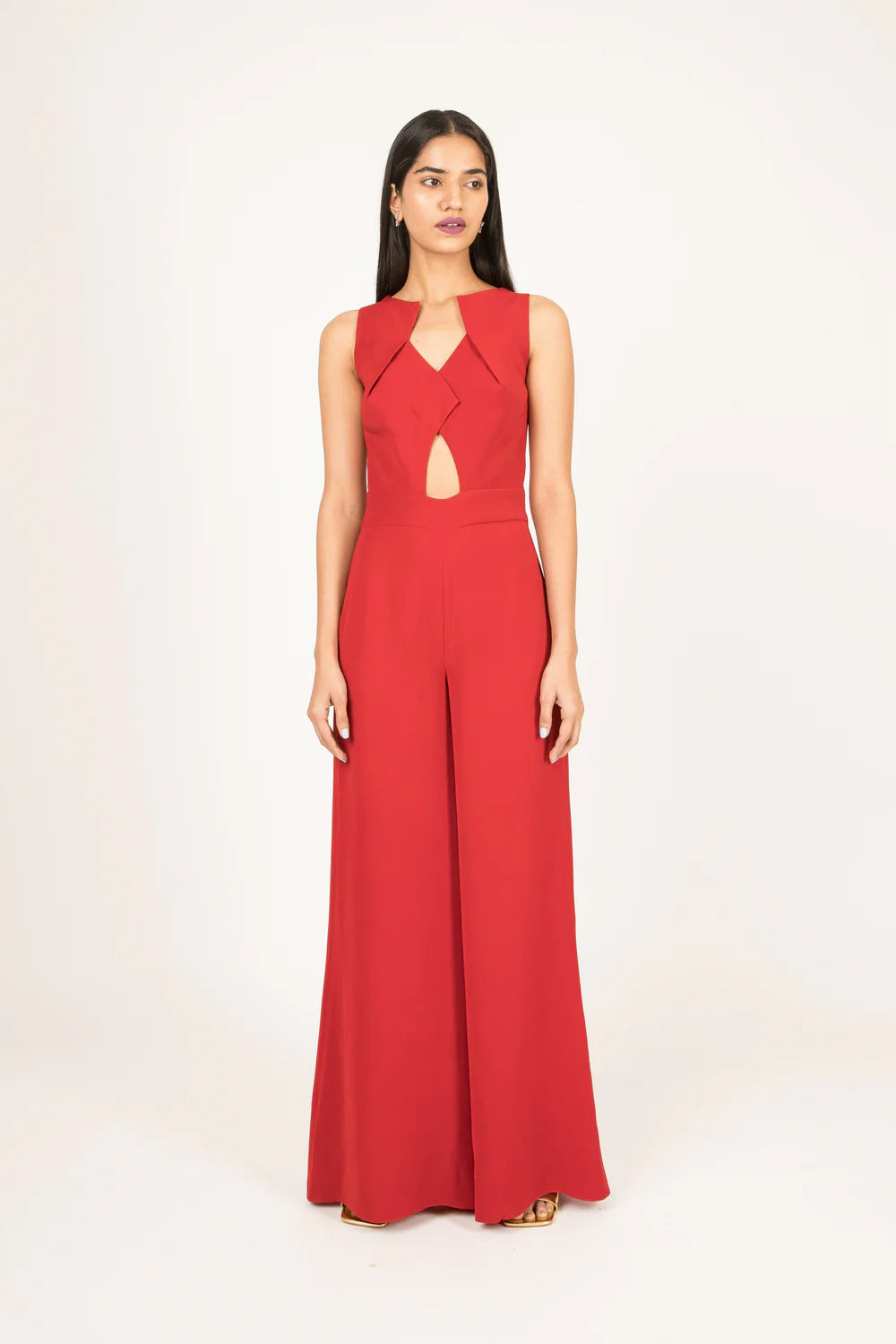 Sculpted draped neckline with a subtle keyhole cutout , fitted bodice that enhances the waist, and wide-leg trousers that create a sleek, elongated silhouette.