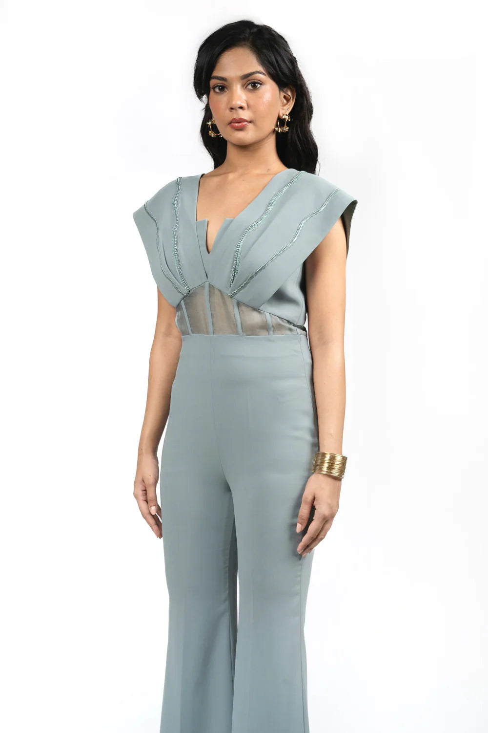 Jumpsuit with an angular draped neckline and structured shoulders, featuring tonal bead embroidery. A sheer waist panel highlights the corset-style fit, paired with flared trousers.