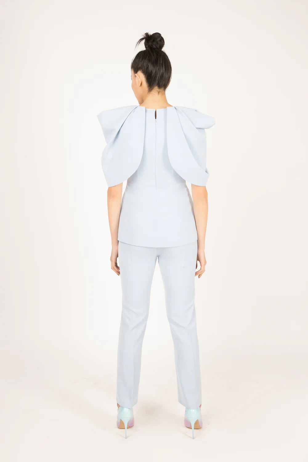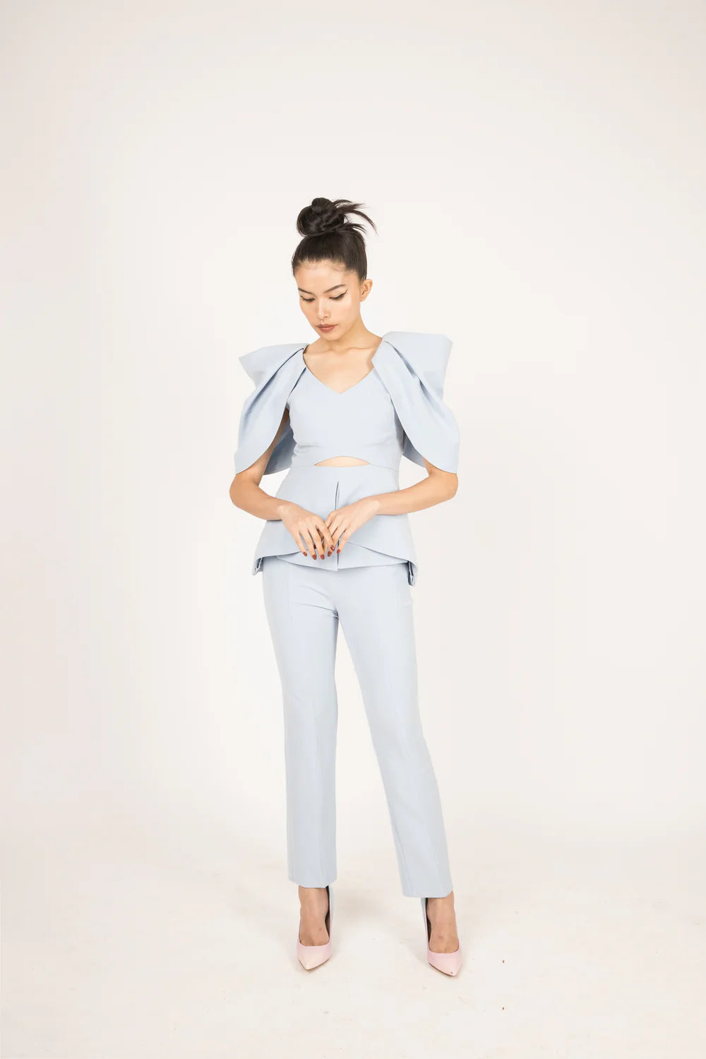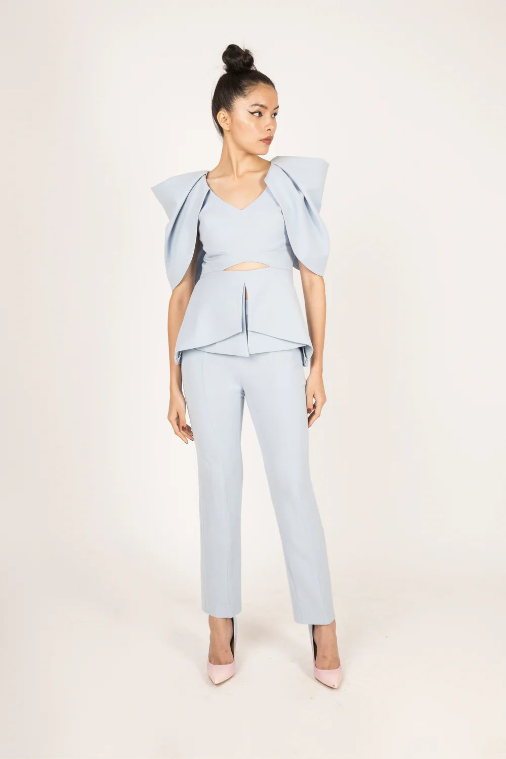 Sculpted top with deep V-neckline, winged sleeves, and a waist cutout. Layered peplum panels shape the silhouette. Paired with slim-fit tailored trousers