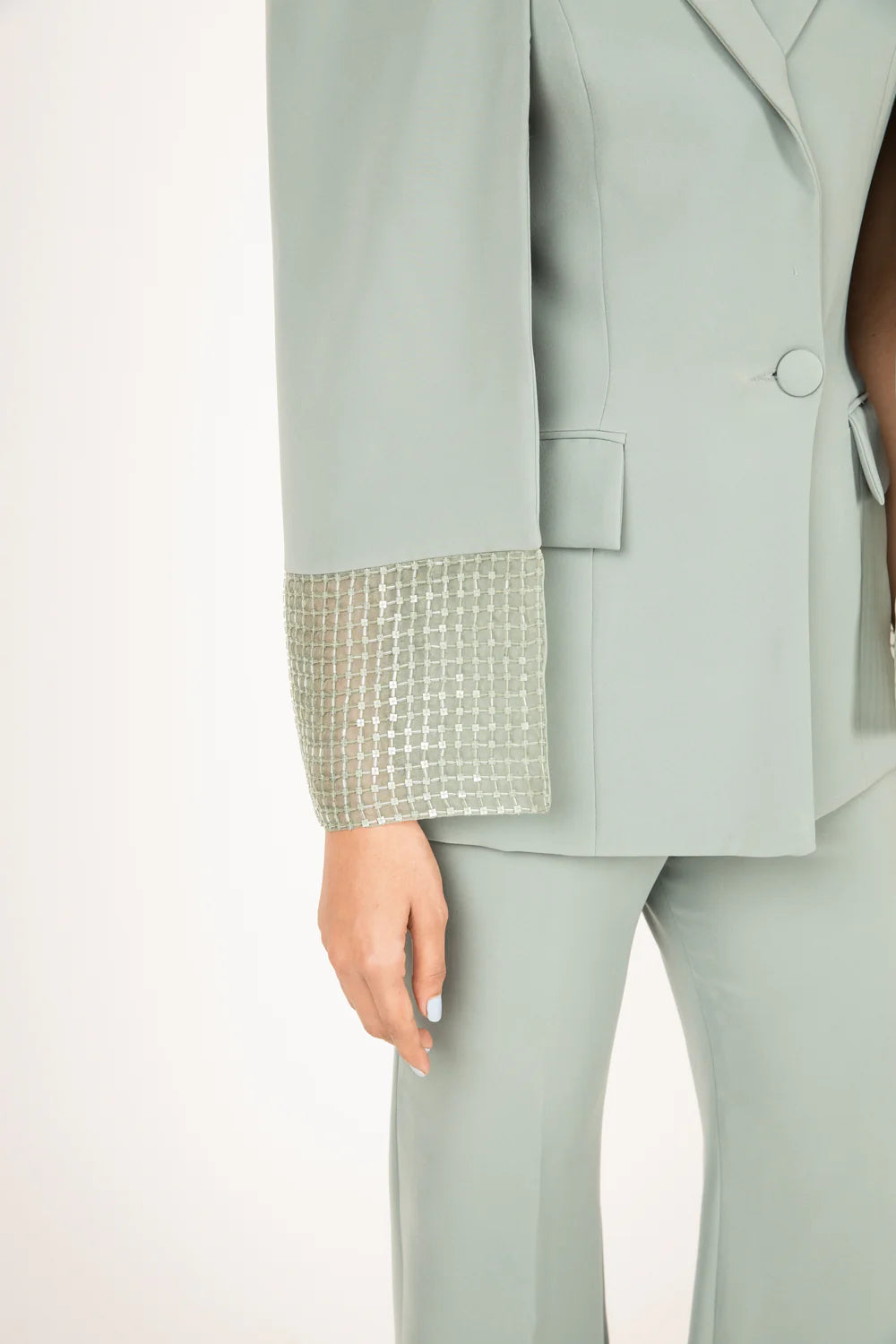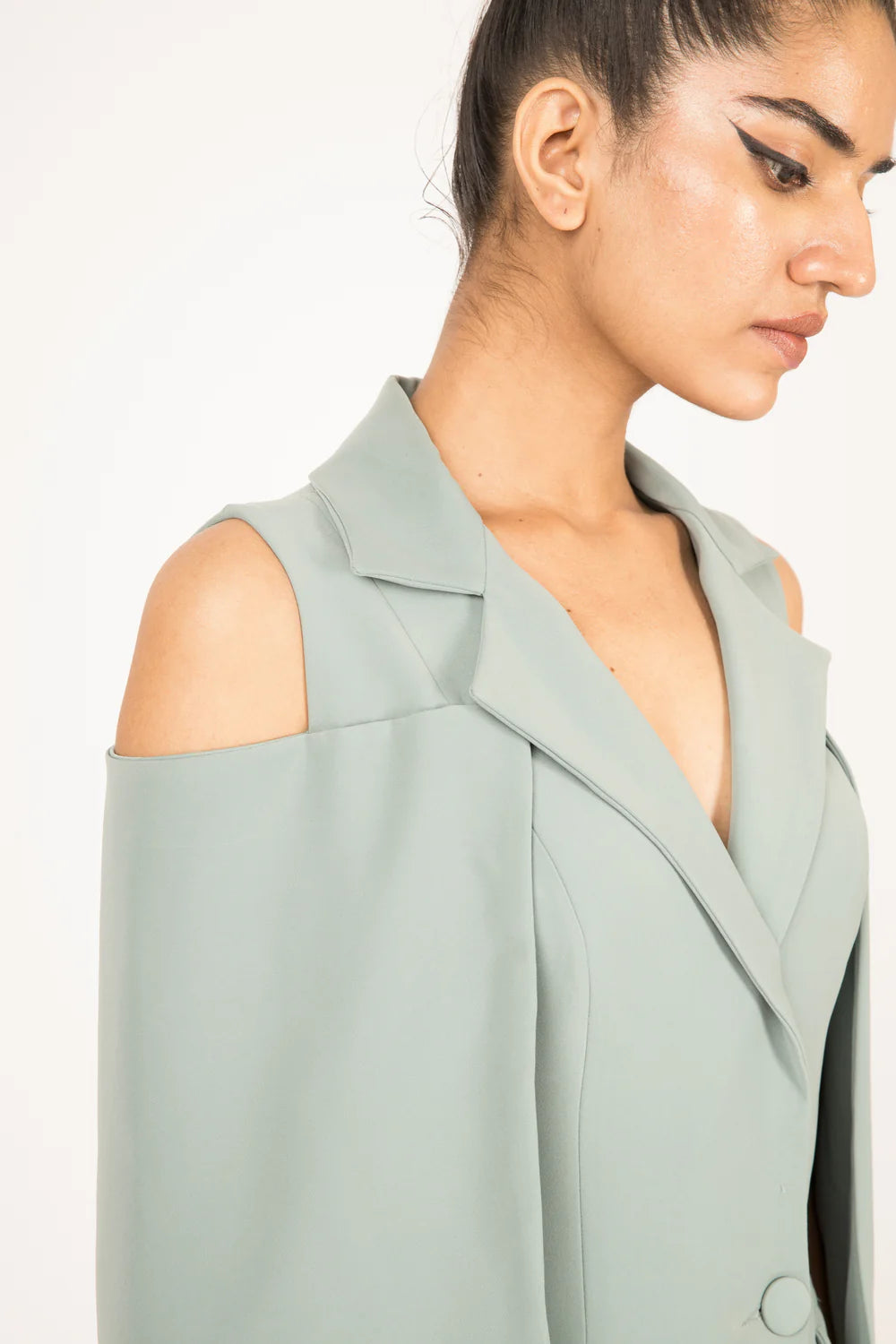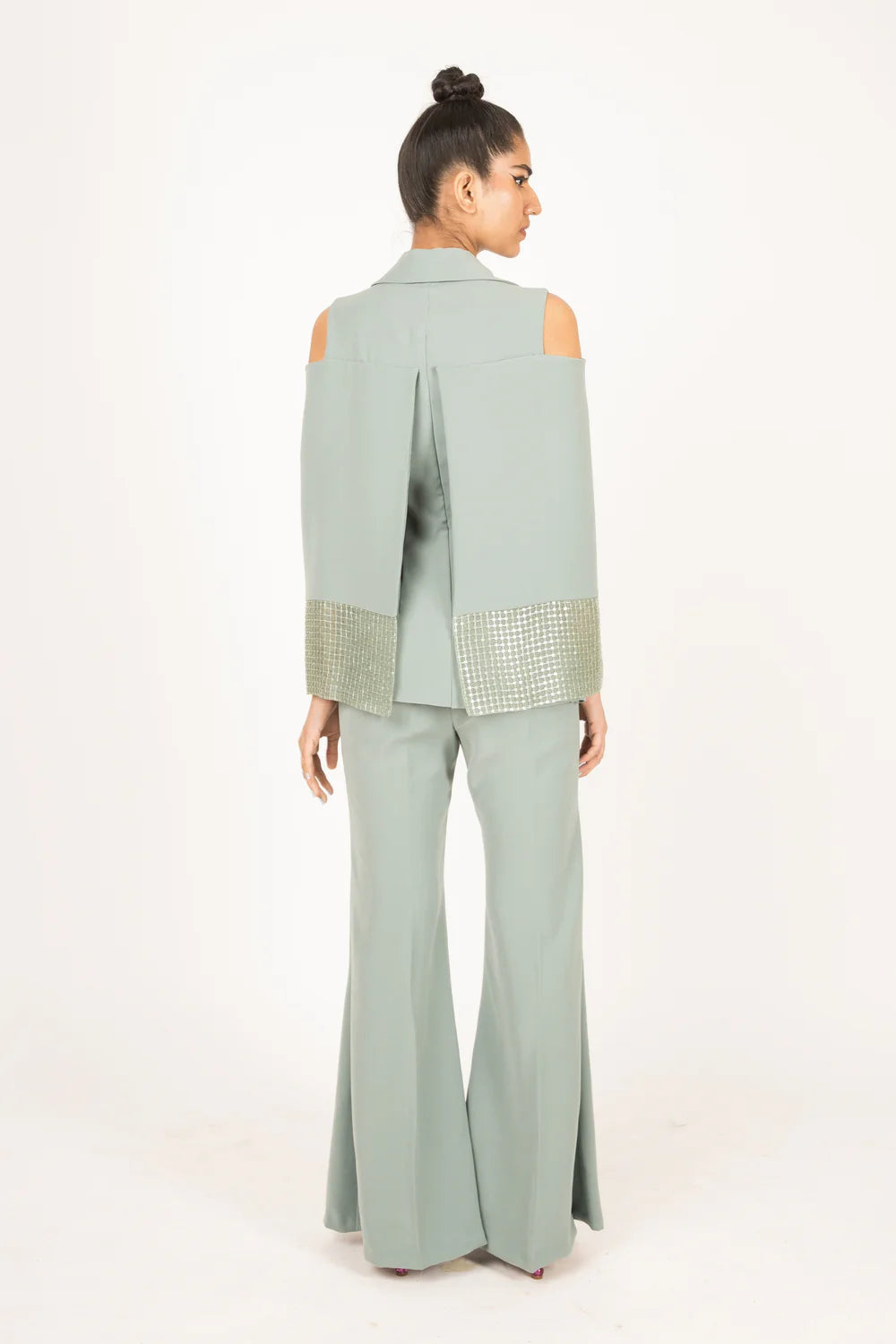 Tailored cape blazer with shoulder cut-outs, finished with hand-embroidered gridwork on the cuffs. Structured collar and single-button closure paired with high-waisted flared trousers.