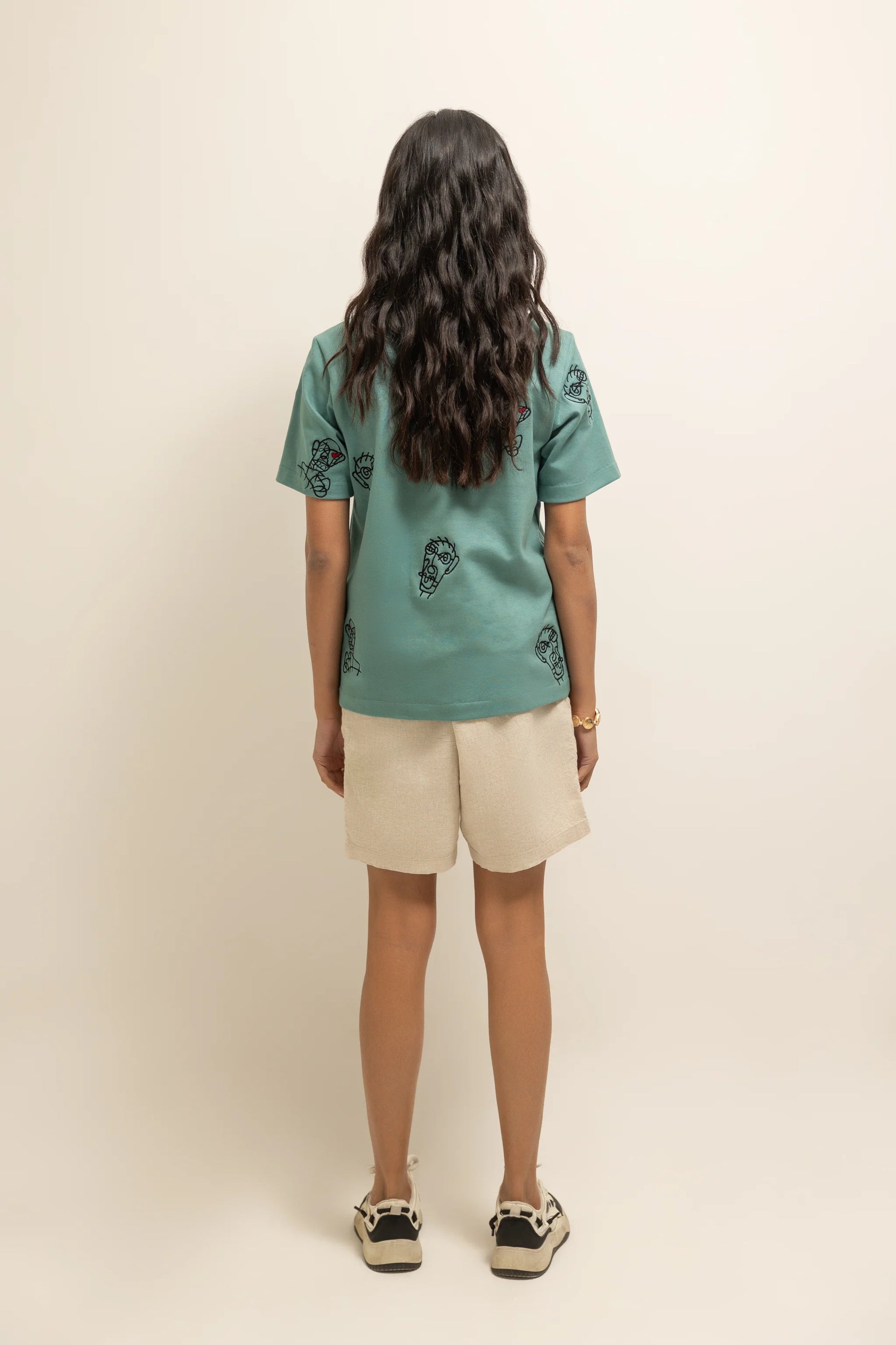 Elevate your summer style with this premium teal blue cotton knit round-neck T-shirt. This piece features abstract face outlines embroidered all over the design, creating a visually striking yet surprisingly simple look. Perfect for both men and women, this tee is ideal for a summer day out. The super-soft, cotton knit fabric ensures maximum comfort, while the vibrant teal blue hue adds a pop of colour to your outfit.