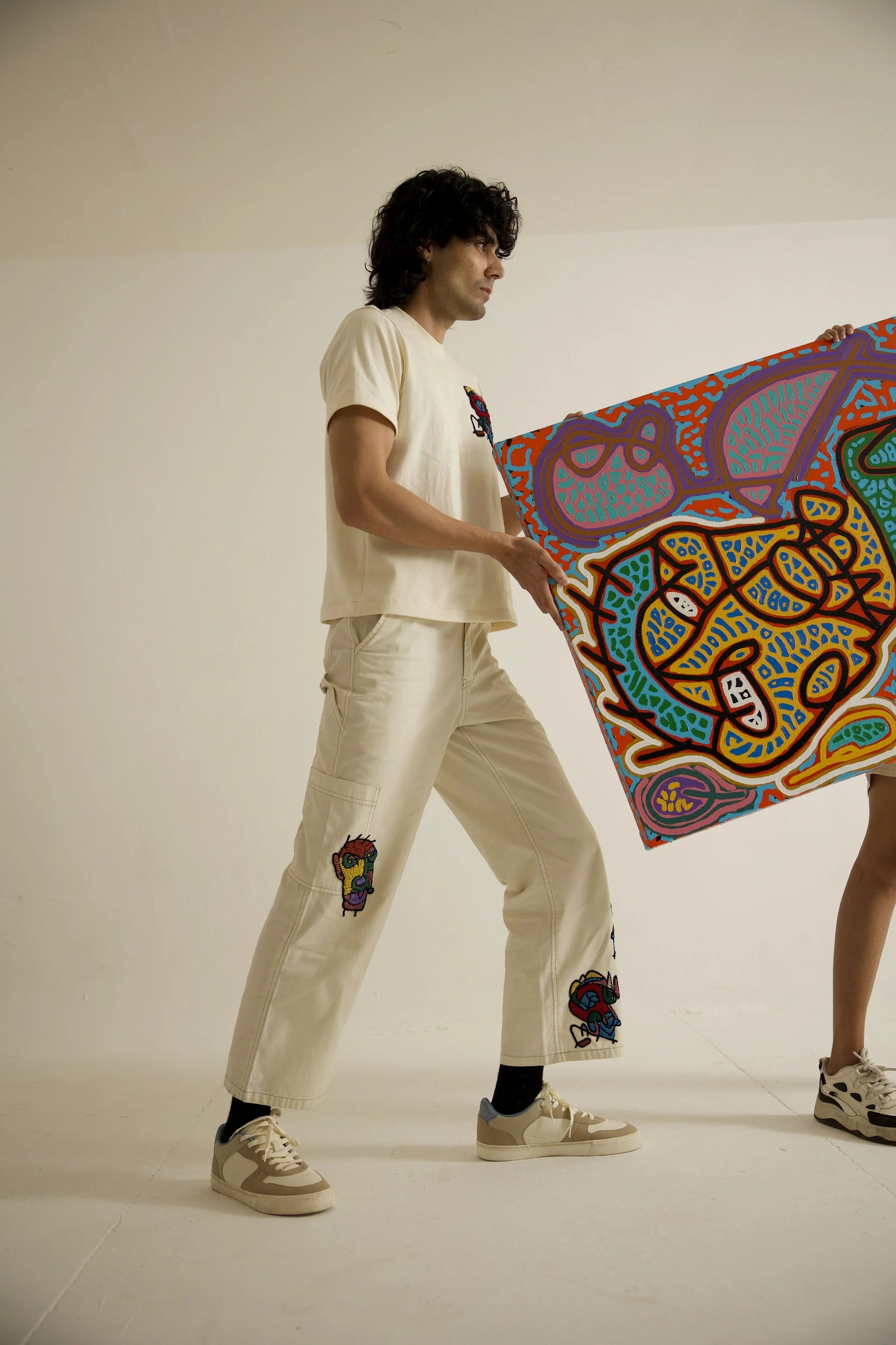 Cream Color: Soft, creamy hue provides a neutral background for the embroidered faces. Embroidered Faces: Intricately embroidered faces scattered throughout the pant add a touch of artistry and whimsy. High-End Feel: Luxurious fabric and expert embroidery create a designer, high-end look. Unisex Design: Suitable for both men and women, perfect for shared wardrobes or as a gift. Versatile Styling: Can be dressed up or down, paired with a variety of tops and shoes for endless styling possibilities. Fabric – Premium Cotton Twill.