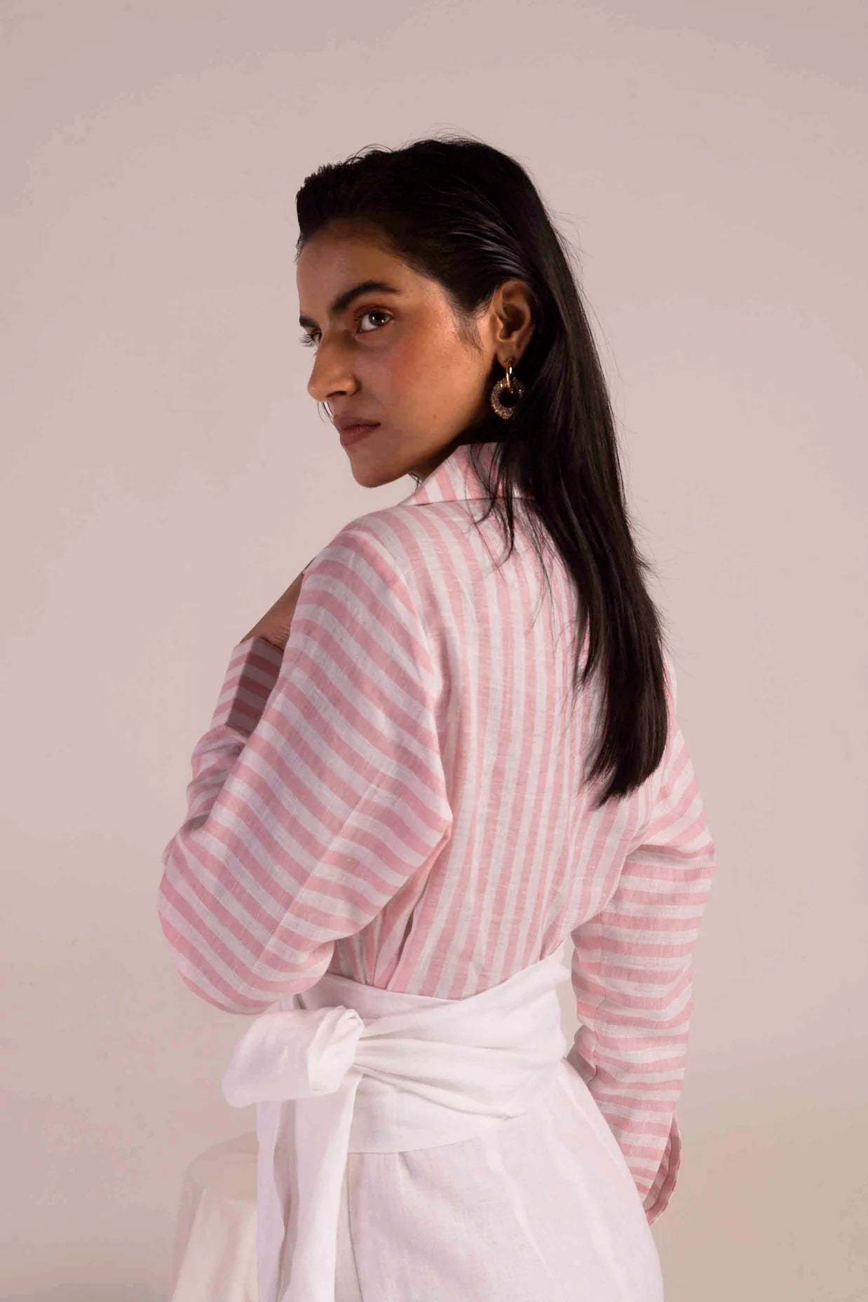 Maritime stripe long dress combines striped and plain linen for a refined look. The striped linen yoke features a notched collar and a concealed front opening, while the plain white linen bottom has a back slit for ease of movement. A long, attached belt at the waist adds a sarong-like drape, creating a fluid silhouette. Finished with a side zip closure.