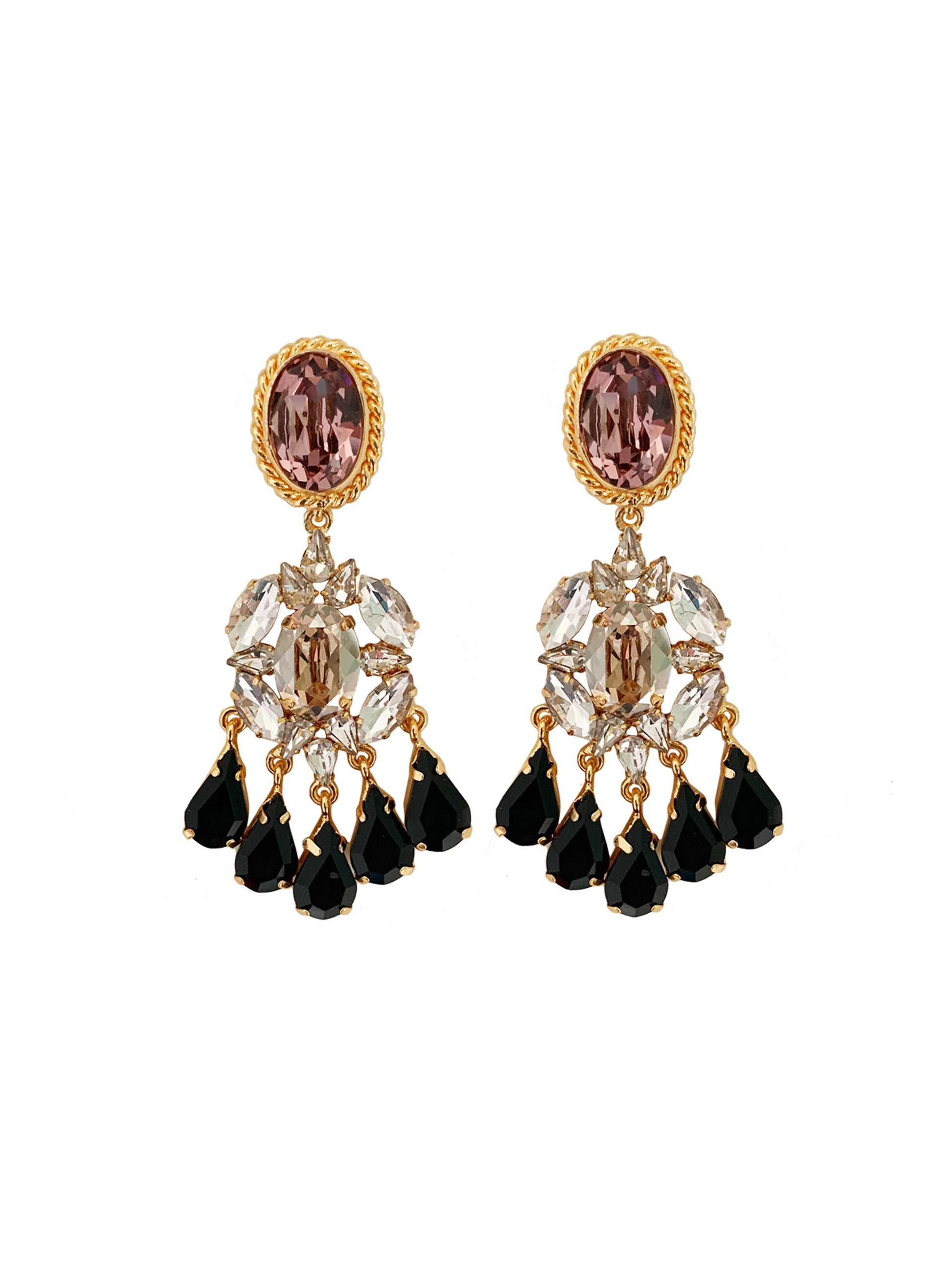 VELOUR BLOOM is a luxe fusion of grace and drama. With a blush-pink stud, crystal cluster, and cascading black drops, these earrings are perfect for statement evenings and glamorous celebrations.