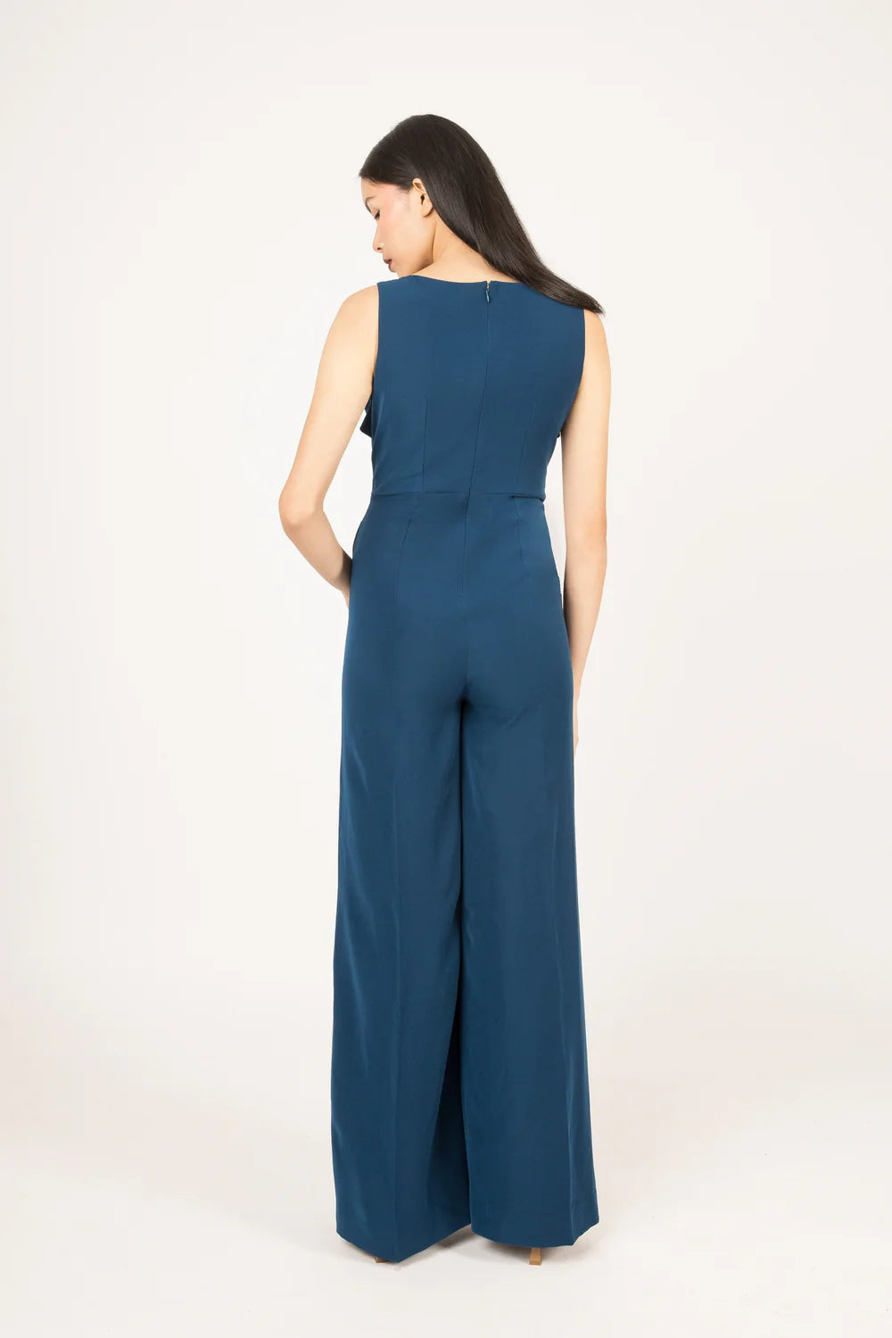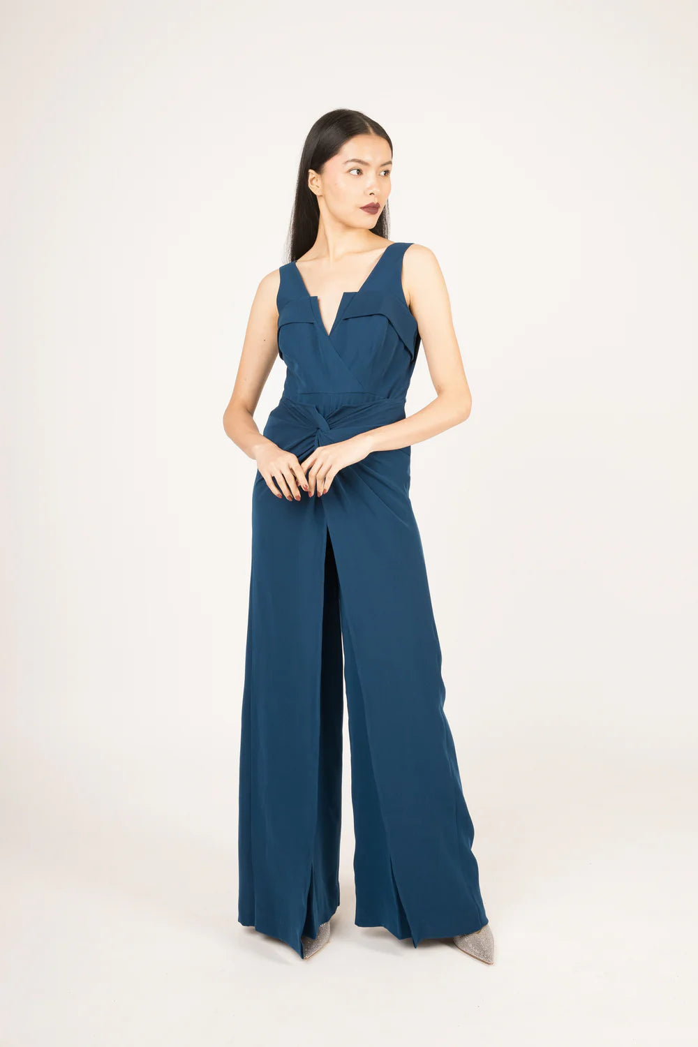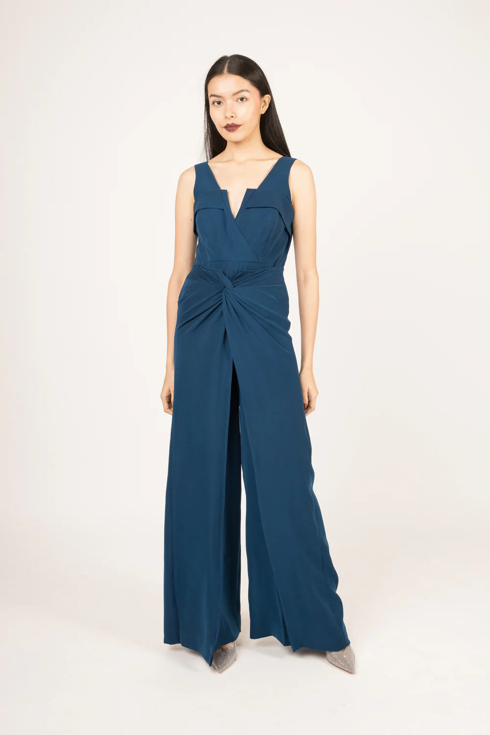 Notched V-neckline with flap panel detailing and a sleeveless, defined bodice. Pleated knot detail at the waist, creating an elegant drape, with a soft panel extending down the front of the wide-leg pants